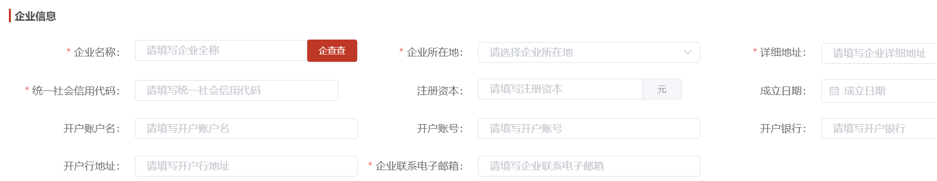 在填写企业名称后,系统提供与第三方企查查对接来执行企业实名认证,认证信息包含了详细地址、统一社会信用代码、注册资本、成立日期;认证信息会带有系统查询标签展示,便于用户区分哪些是人工填写,哪些是系统认证查询。考虑到企业第三方系统查询信息存在信息的延迟性,提供对企业认证信息执行二次修改,二次修改后,标识会从系统查询更新为人工修改。