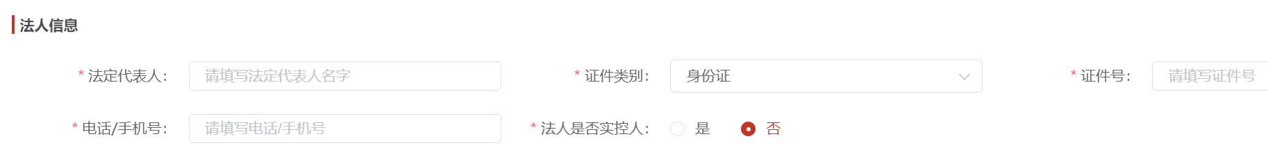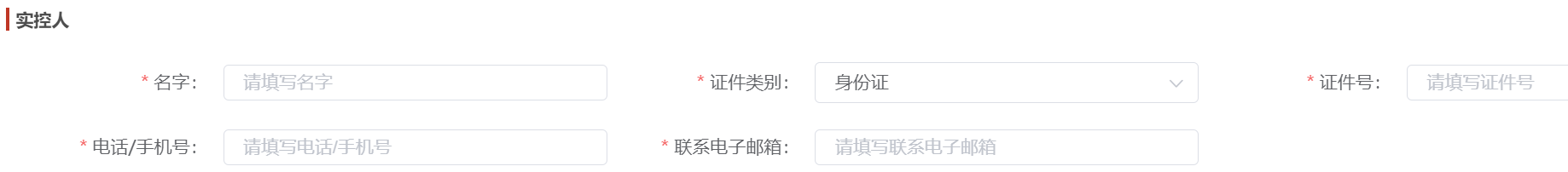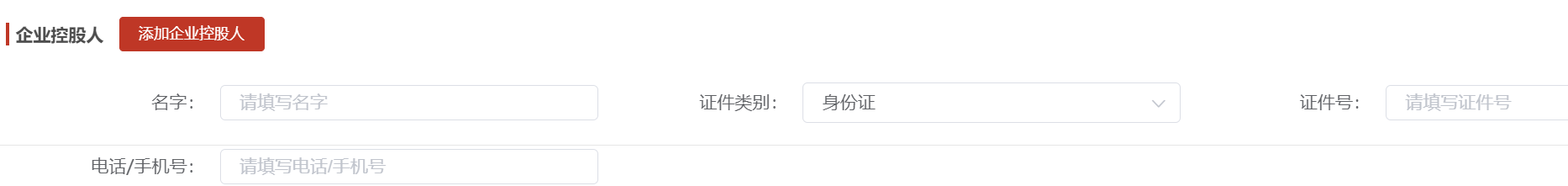 法人信息、企业控股人信息、实控人信息根据企业的实际情况,对应填写,由于存在一个企业的企业控股人或实控人会存在多个,则提供根据实际情况自定义添加相关信息;