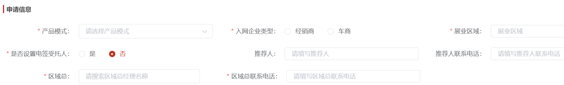 申请信息主要填写产品模式、申请入网企业的类型、申请业务区域范围省市区包含哪些、该企业申请是否有电签受托人和推荐人