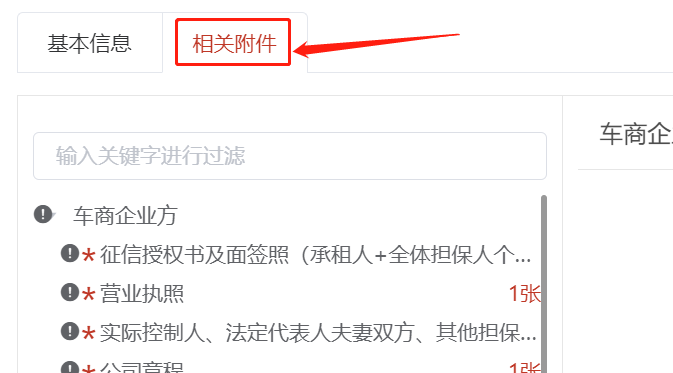 附件信息的类别包含了车商企业方和担保方;系统提供查看每个附件上传的标准,便于入网企业按照审核标准上传资料,提高审核通过率;