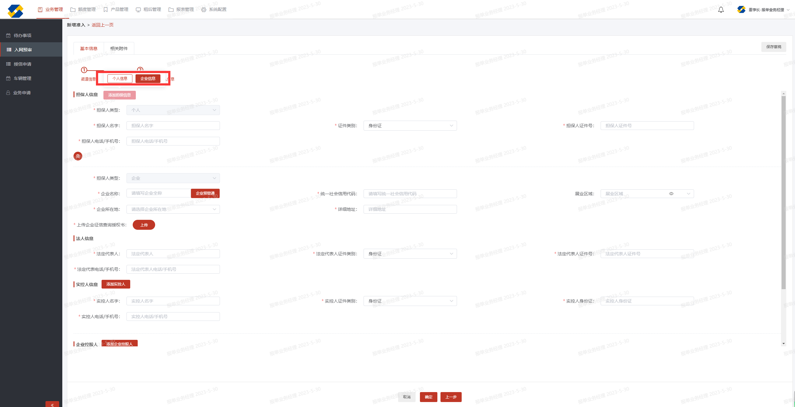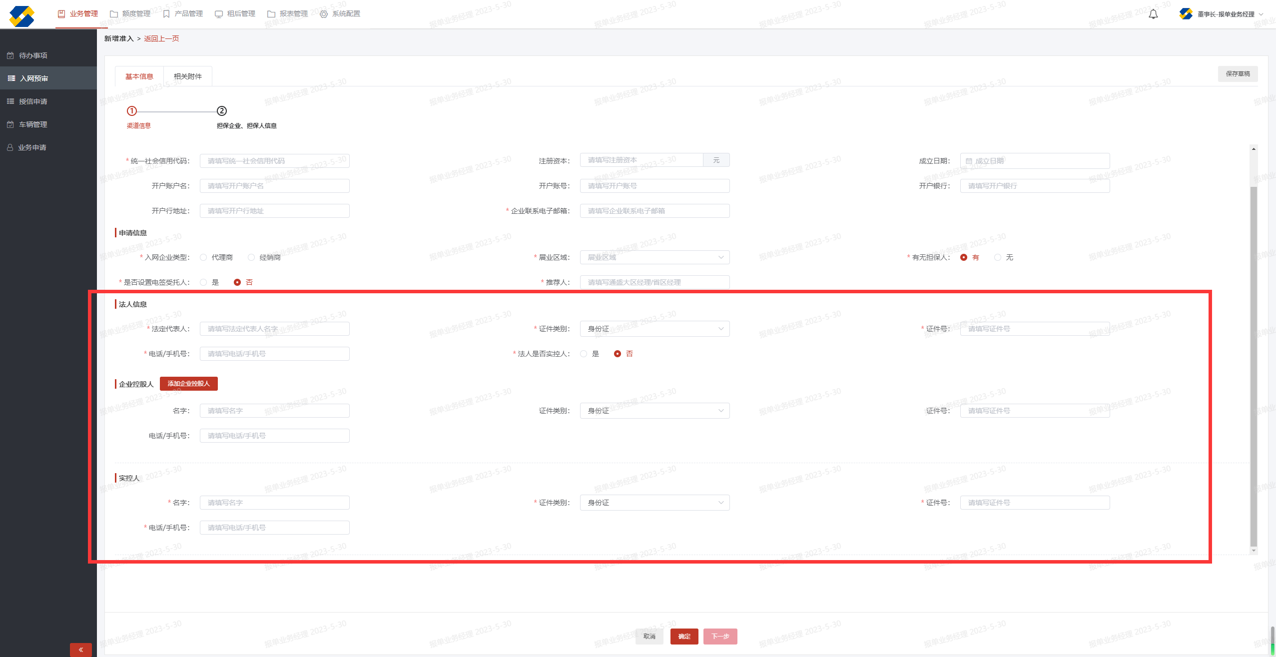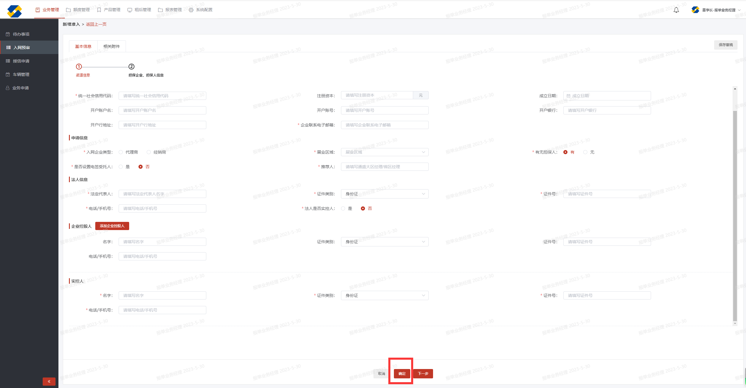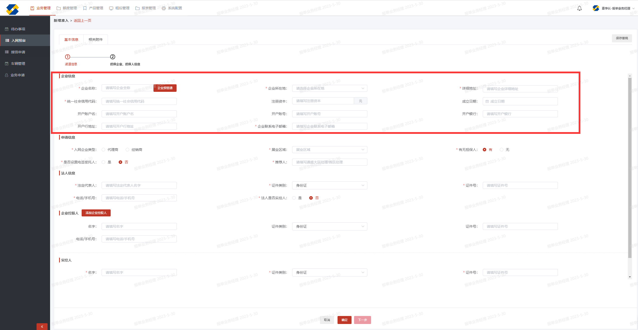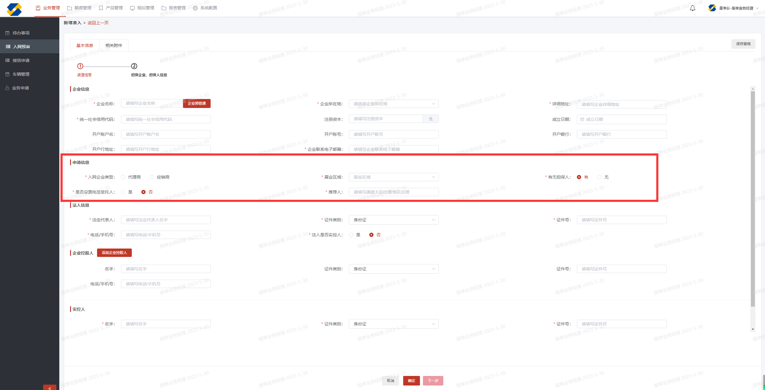 需要填写的基本信息包含入网申请的企业信息,申请信息、法人信息、企业控股人信息、实控人信息,标识红色星号的为必填项。