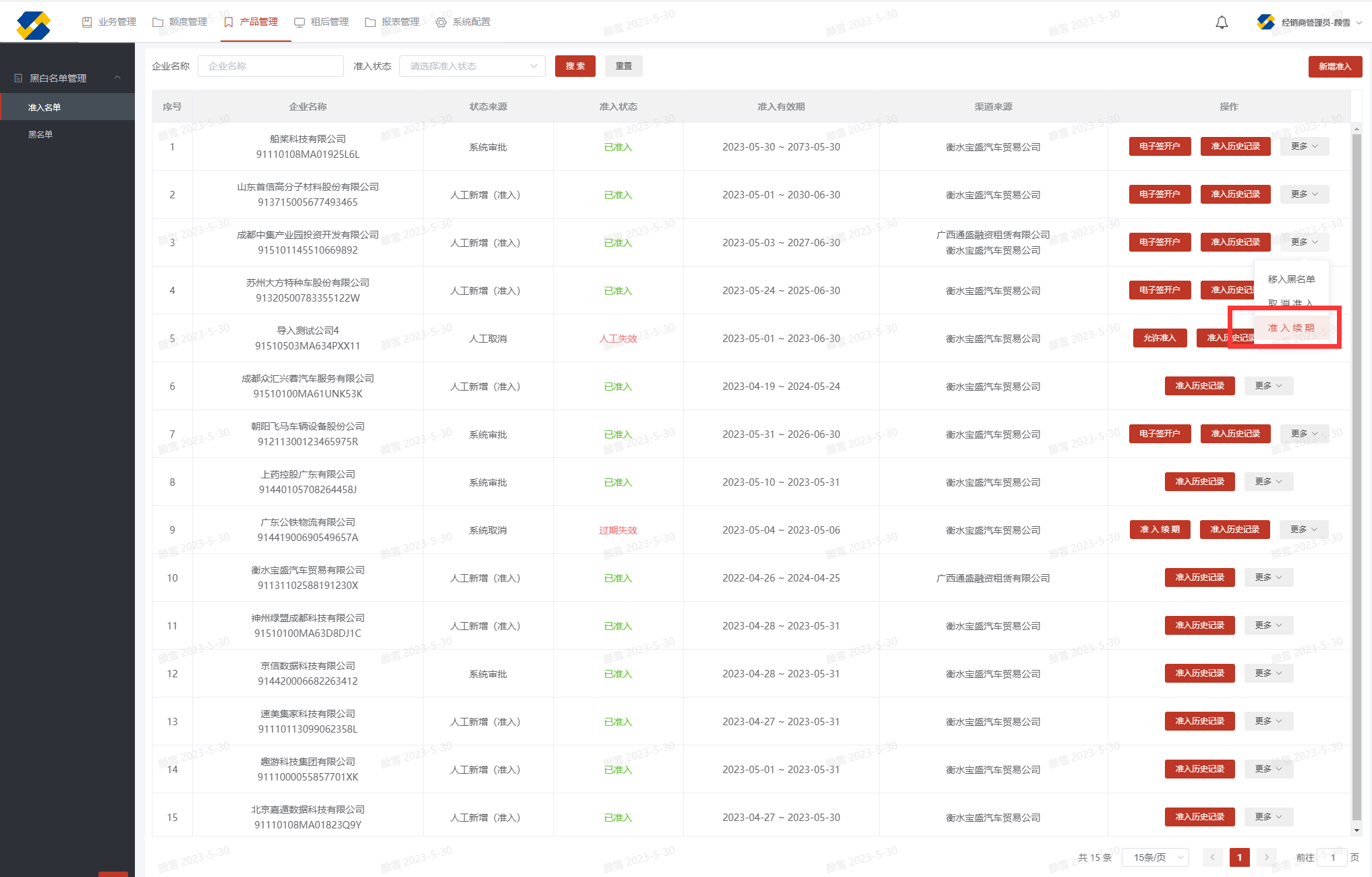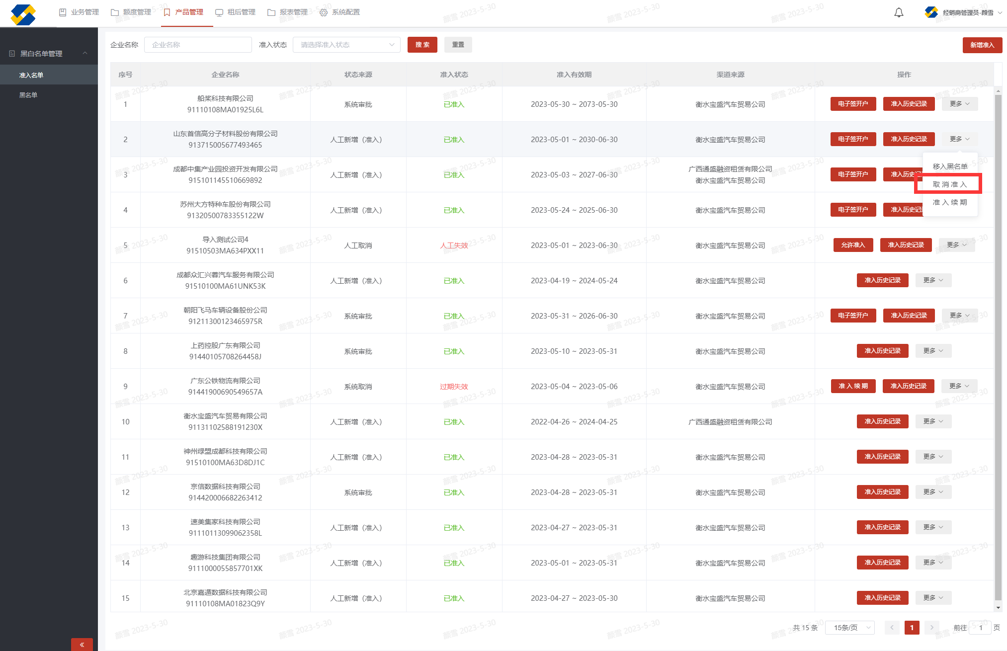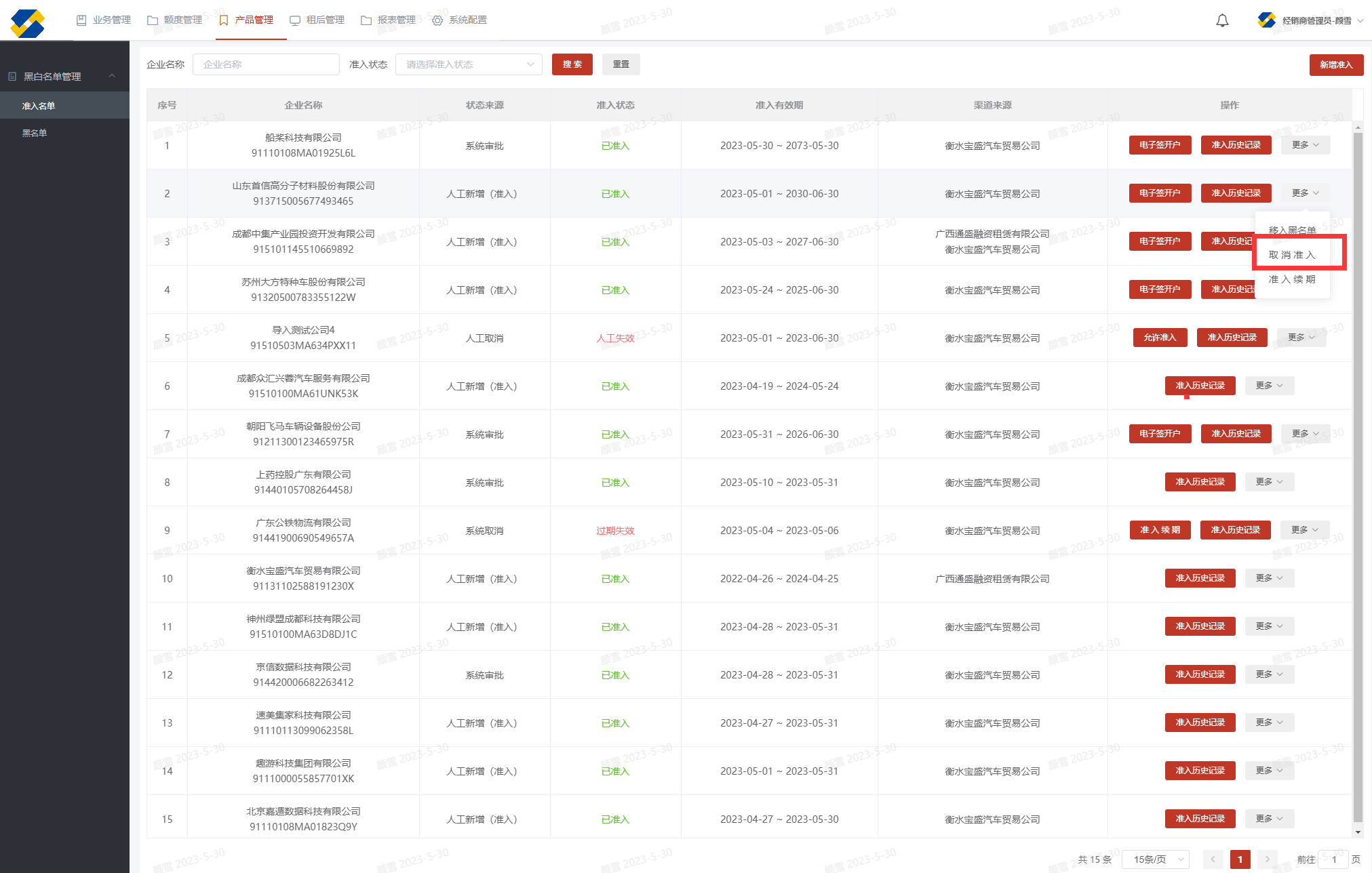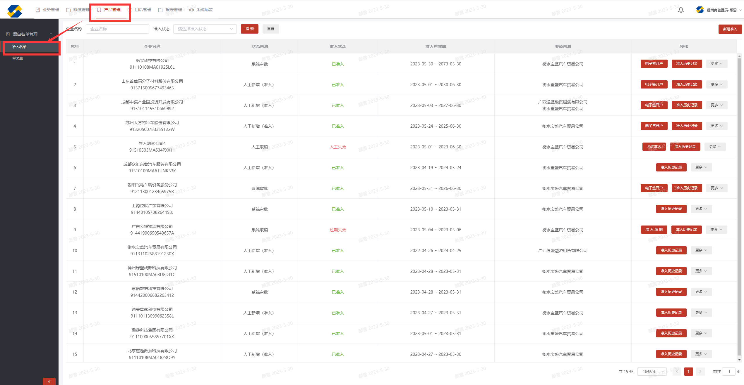 刚刚准入成功的企业已在准入名单中显示,可以看到他的准入状态、准入期限以及渠道来源。