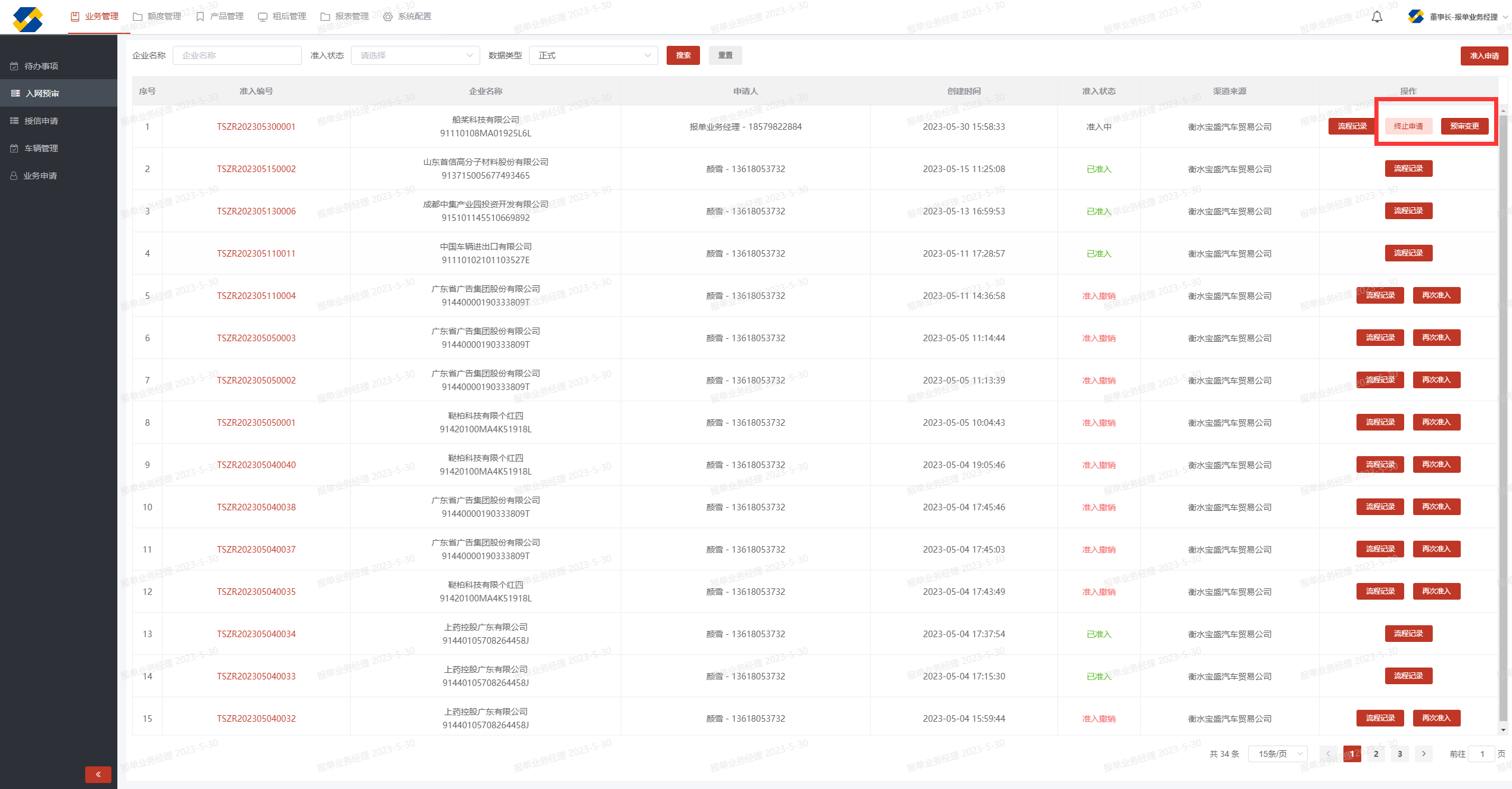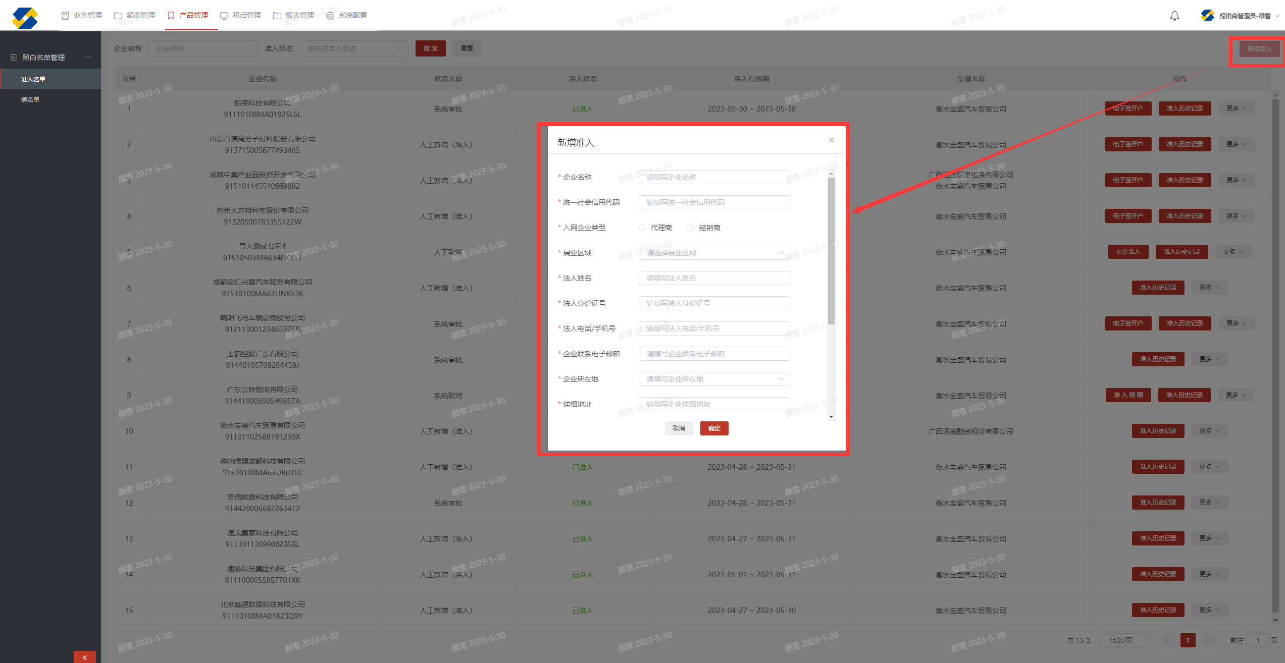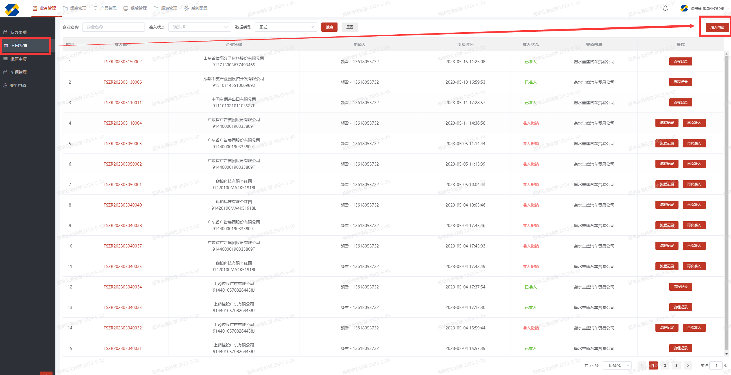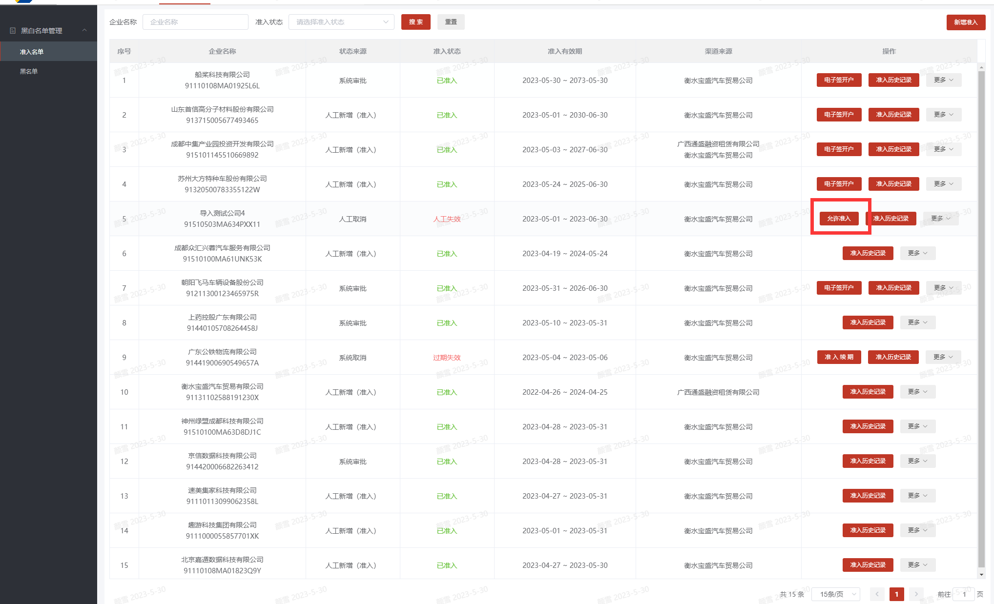 刚刚准入成功的企业已在准入名单中显示,可以看到他的准入状态、准入期限以及渠道来源。