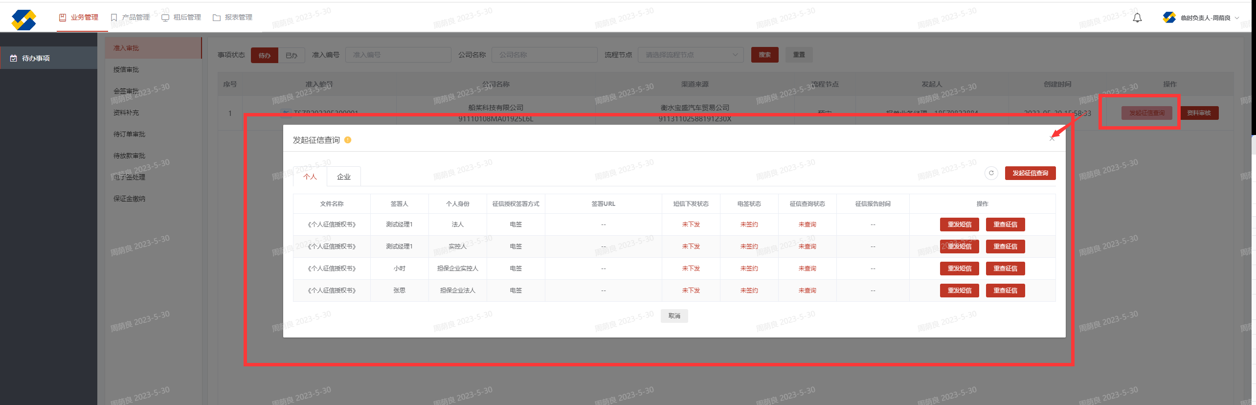 在审批人员点击发起征信查询后,将同步对个人发起电签授权、企业发起征信查询;列表上可以实时看到短信下发情况、授权签署情况及征信查询情况;