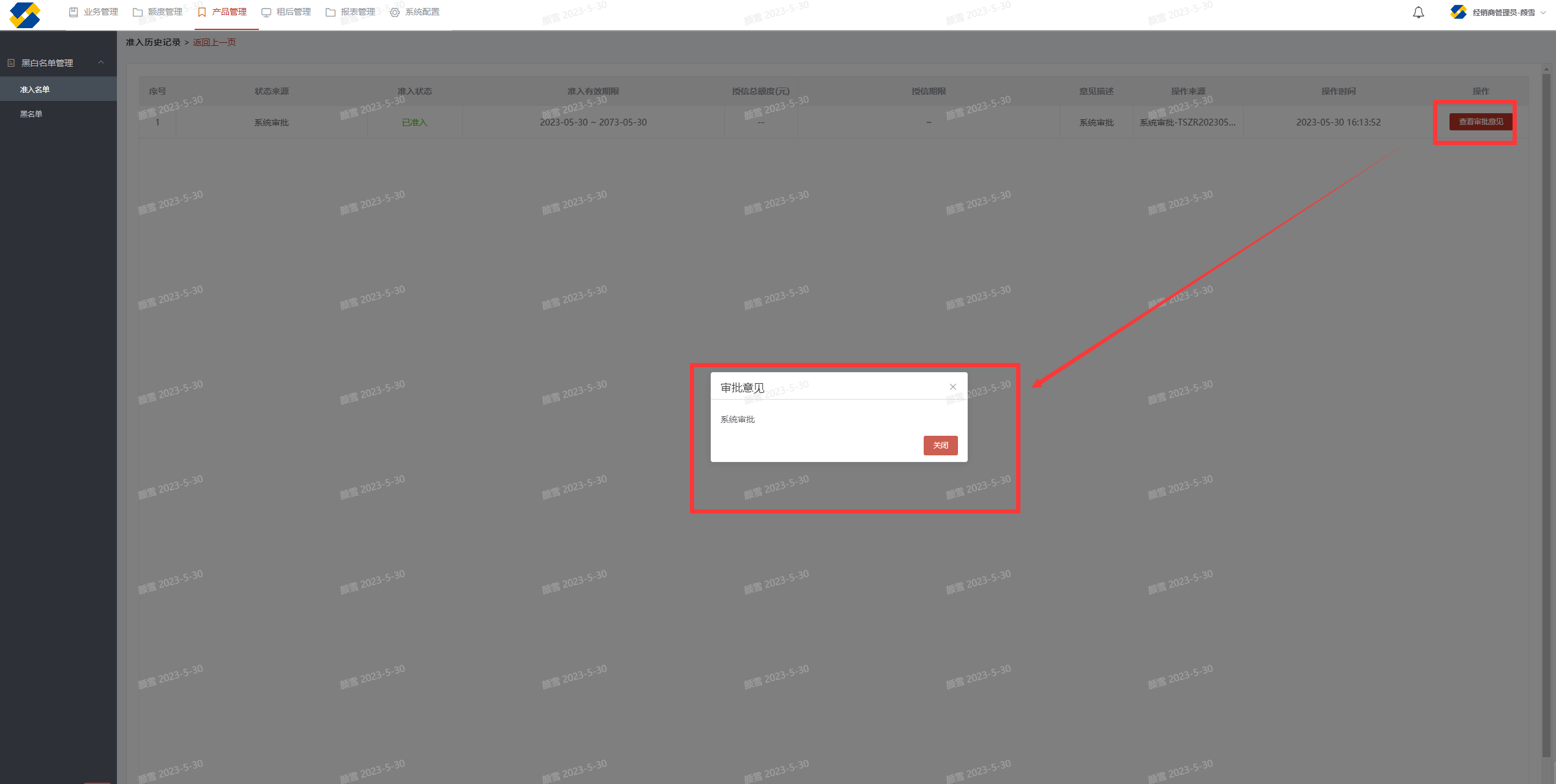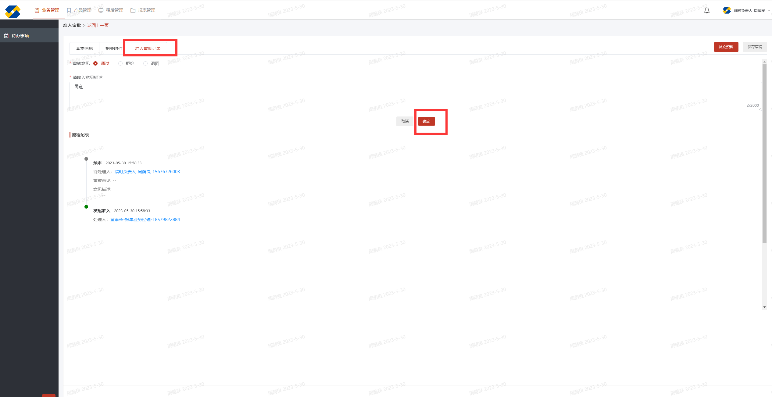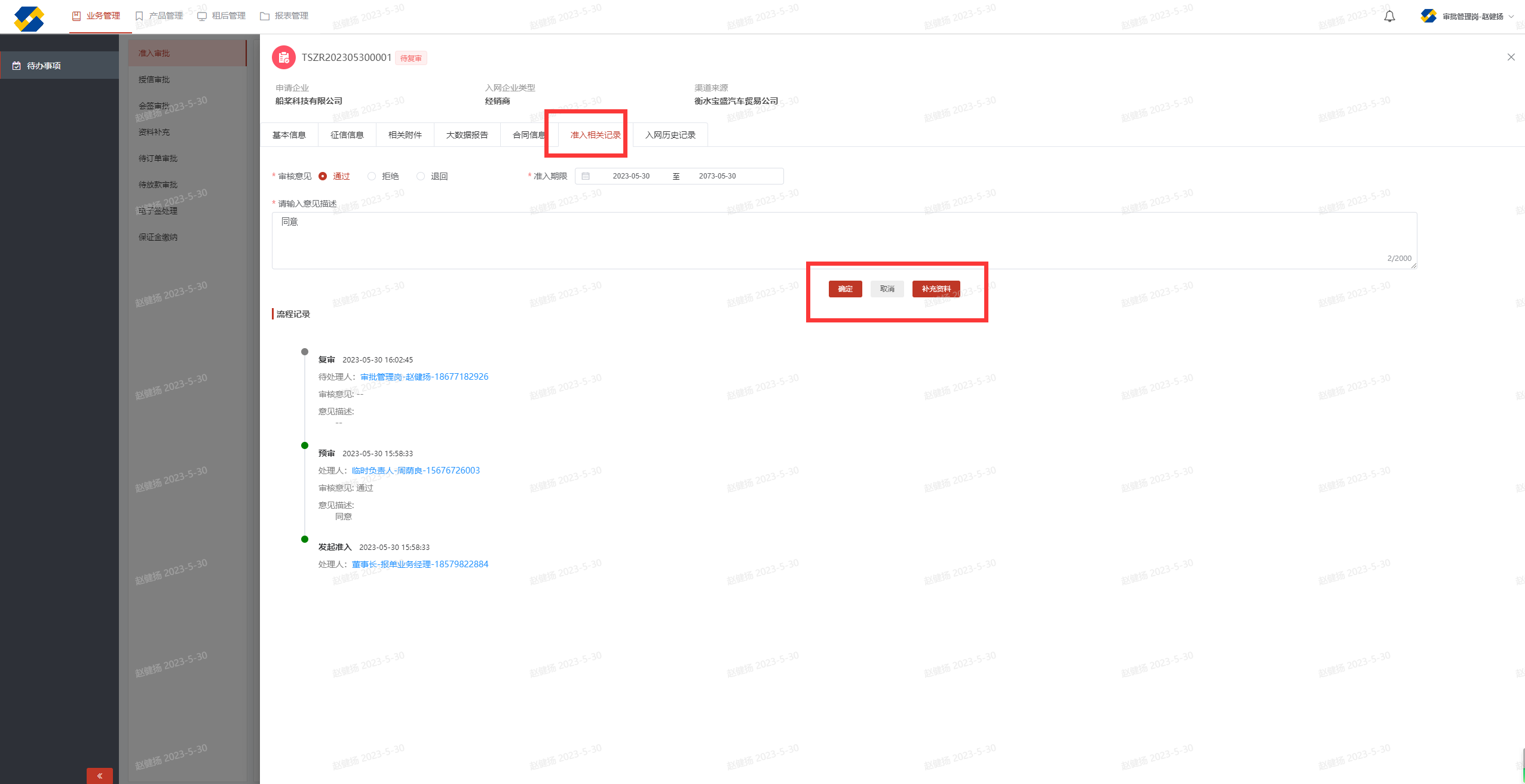 在完成检查和风险评估后,风险经理可点击准入相关记录,执行对待办订单的审批,如果审批通过,则填写对应的准入期限,如有意见,也可填写对应的意见描述,在执行确定时,系统会告知复审通过后,经销商可以登录办理业务,审批人员在确认操作后,流程流向下一处理人。