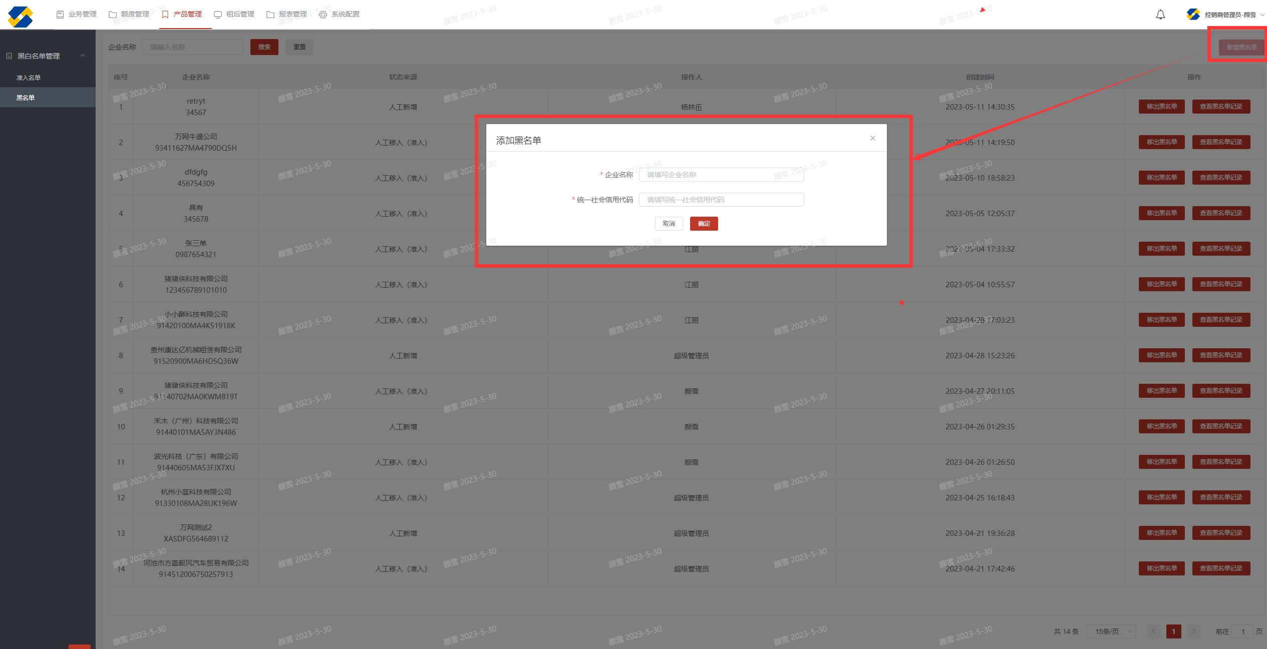 当通盛相关人员经核查到经销商存在欺诈或骗贷嫌疑时,此时可通过新增黑名单按钮,将该企业加入到黑名单;