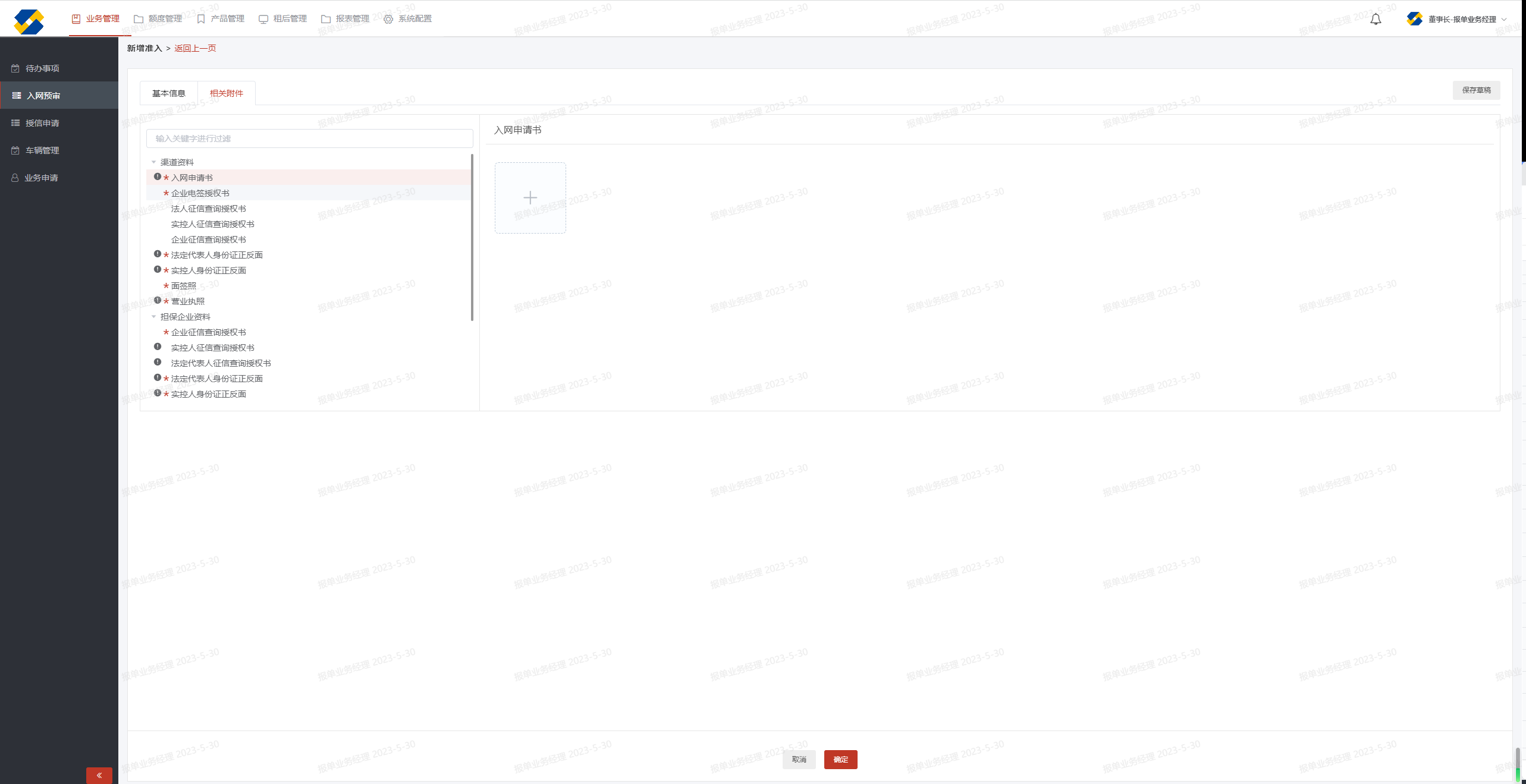 附件信息的类别包含了渠道资料、担保企业资料、担保人资料以及补充资料;担保企业及担保人资料类别仅在添加了担保企业或担保人信息的条件下,才对应出现该类别;反之则不需要上传;系统提供查看每个附件上传的标准,便于入网企业按照审核标准上传资料,提高审核通过率;