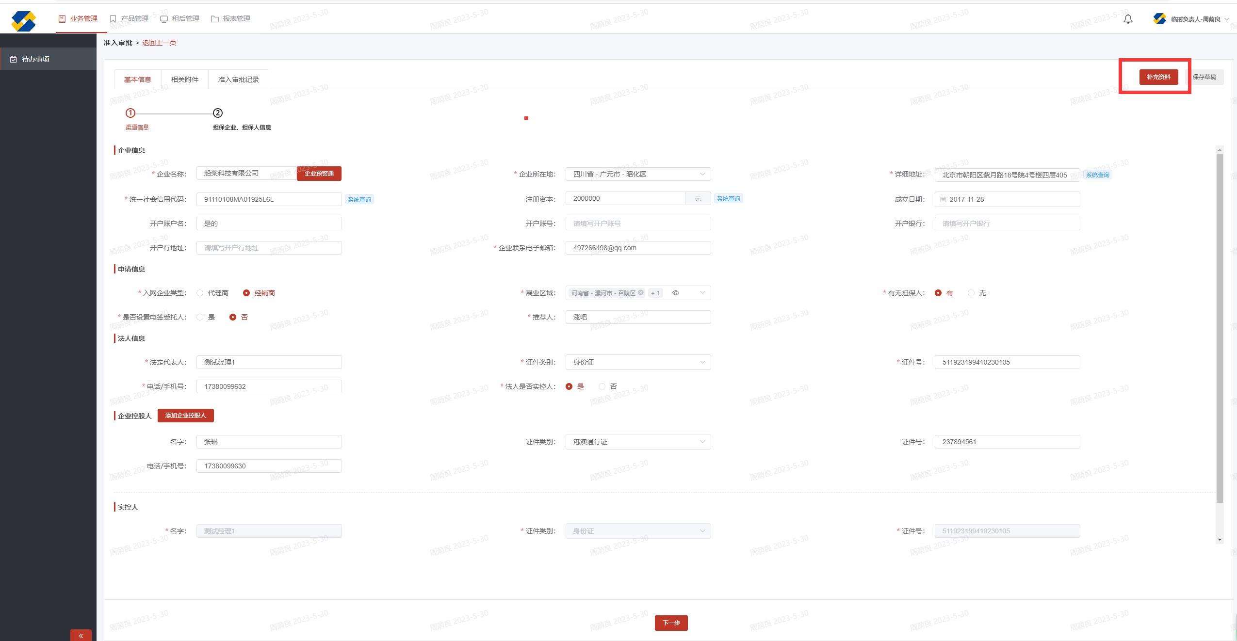 也可以通过补充资料功能,对需要更新的资料进行勾选,如果需要提供额外的其他信息,则可以在文本框中备注需要提供的额外资料信息说明;执行资料补充的接收人默认是该准入订单的发起人,审批员也可以下拉选择该准入环节流程下的其他人员。选择后,指定人员将会资料补充的待办下收到需要补充资料的待办;