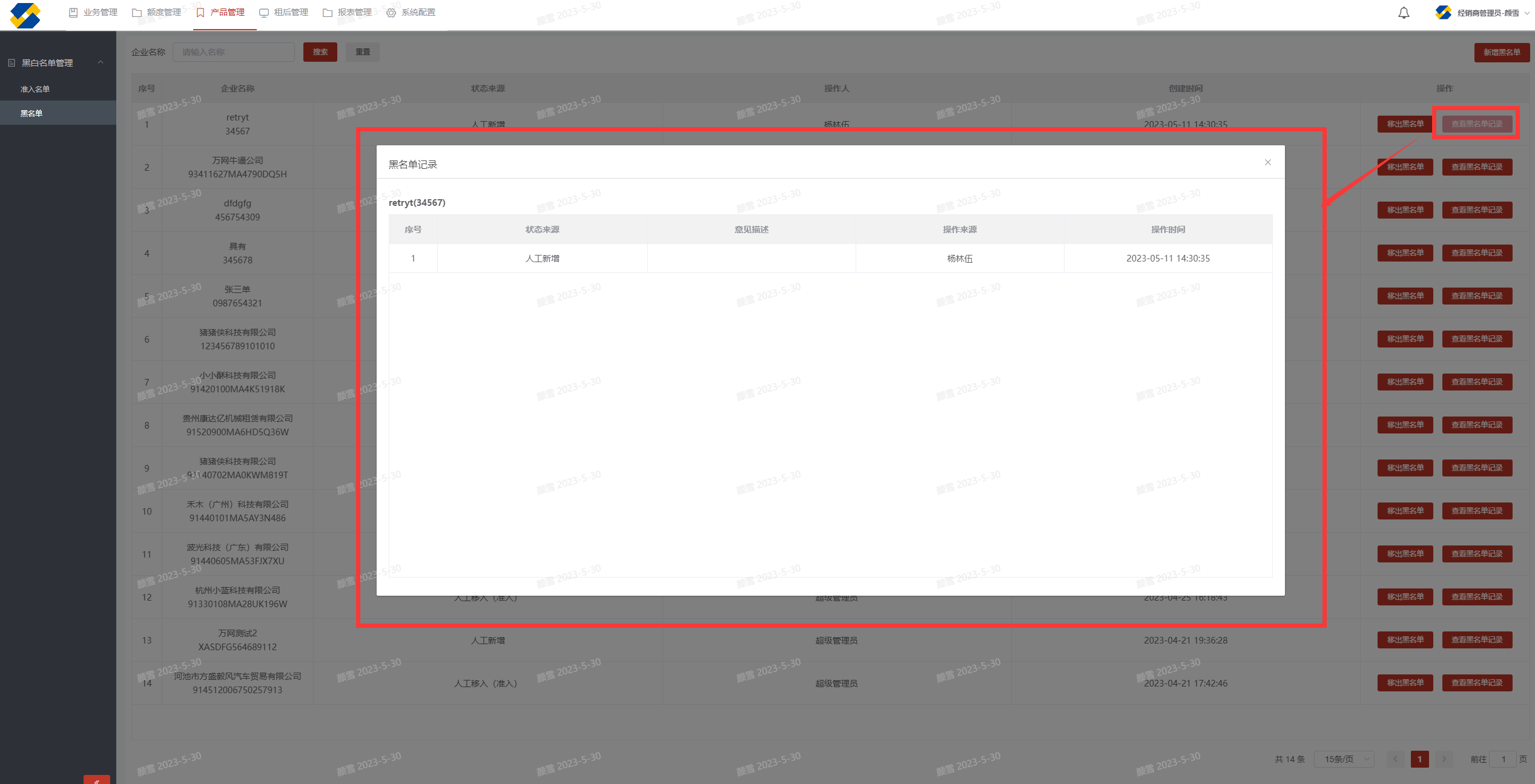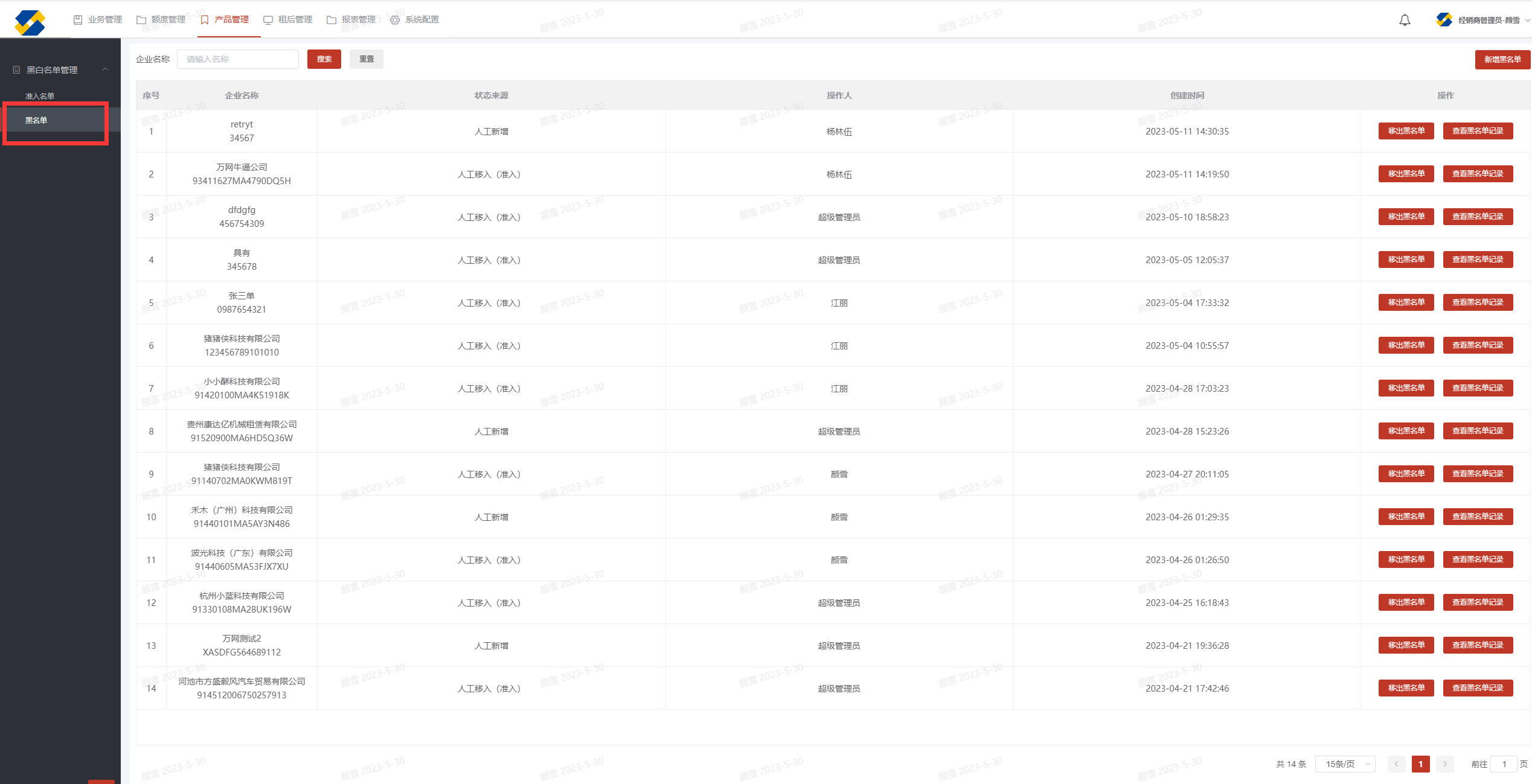 展示的黑名单列表来源于通过准入移入的和通过黑名单新增的企业;