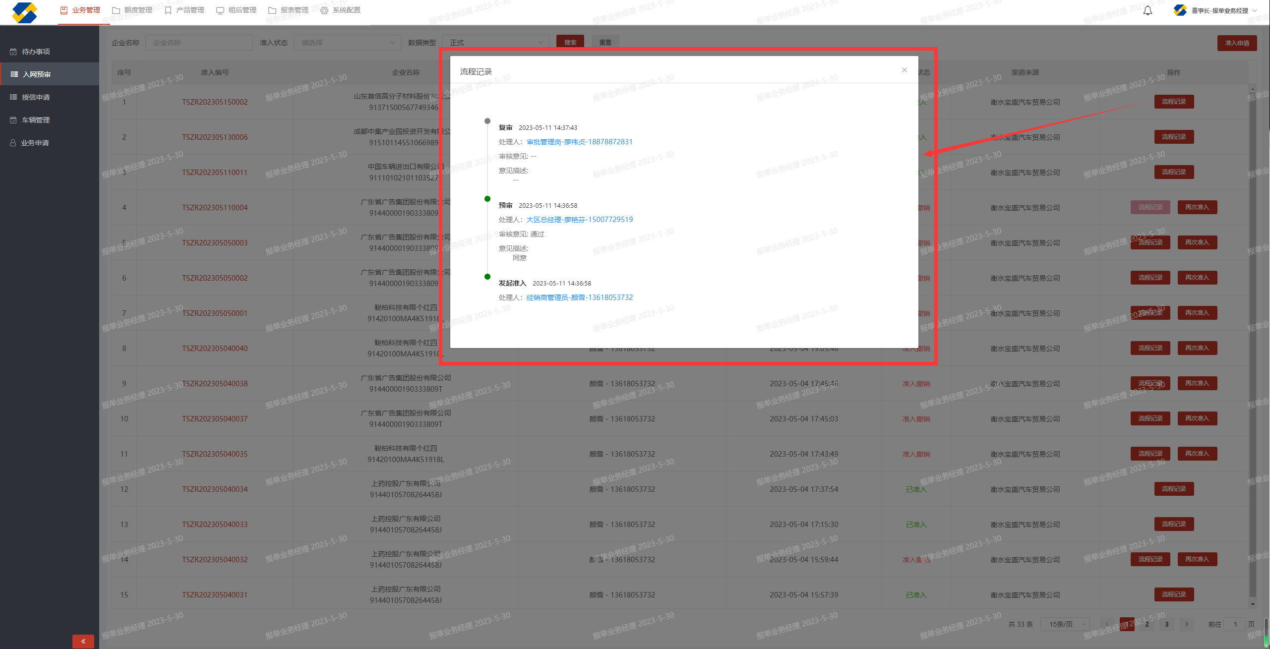 系统提供入口,供经销商查看企业准入历史变更情况,包含企业走系统审批和被人工执行调整准入状态的记录;