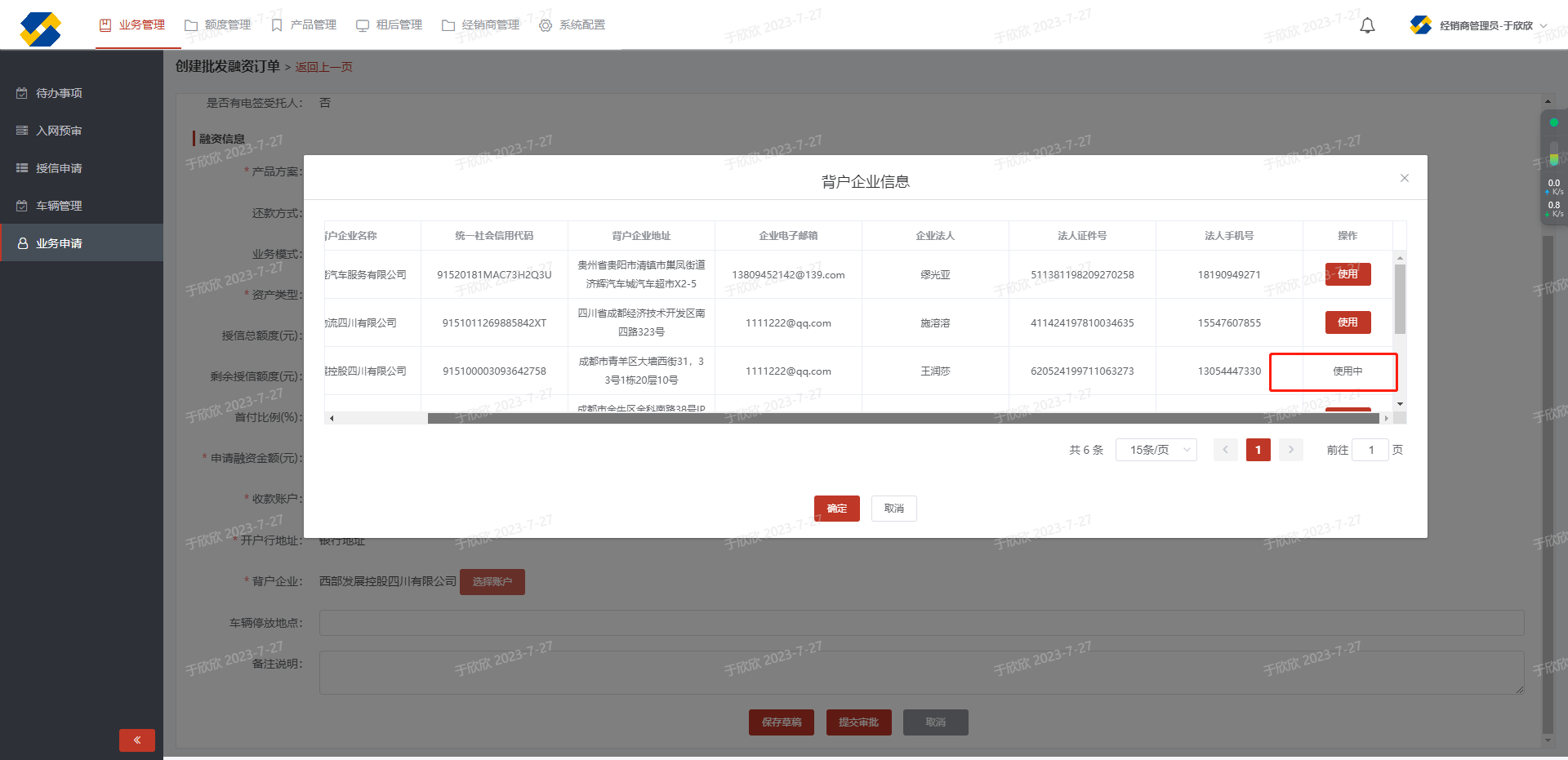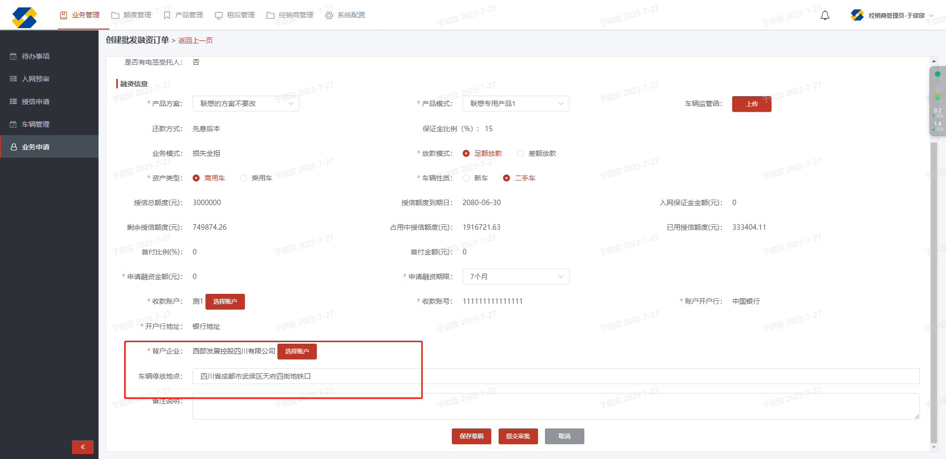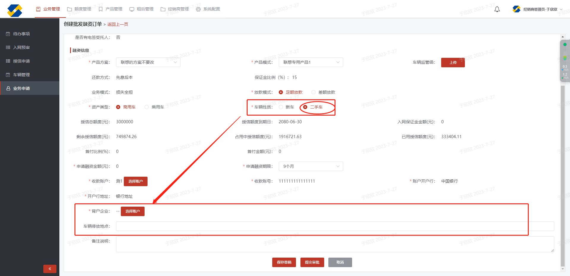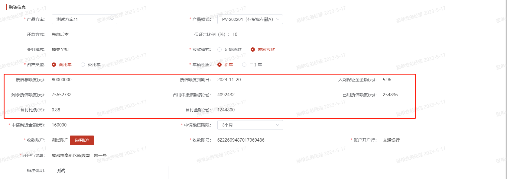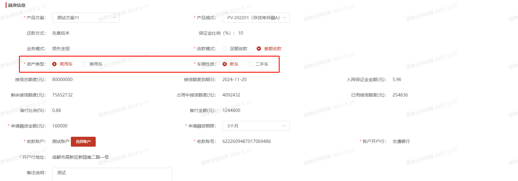 ④授信额度与授信期限,由选择的资产类型和车辆性质显示对应的在期授信额度