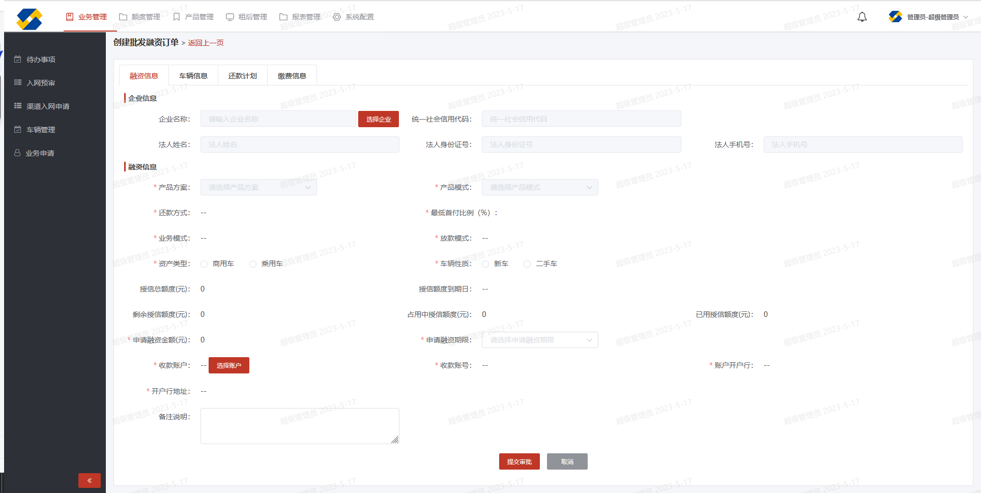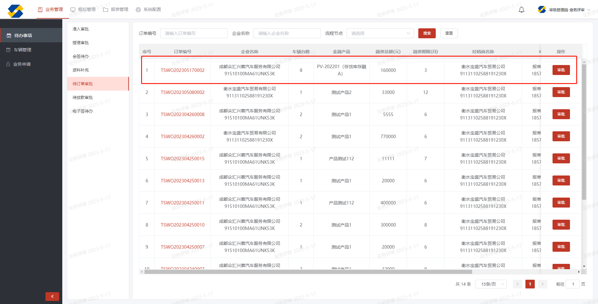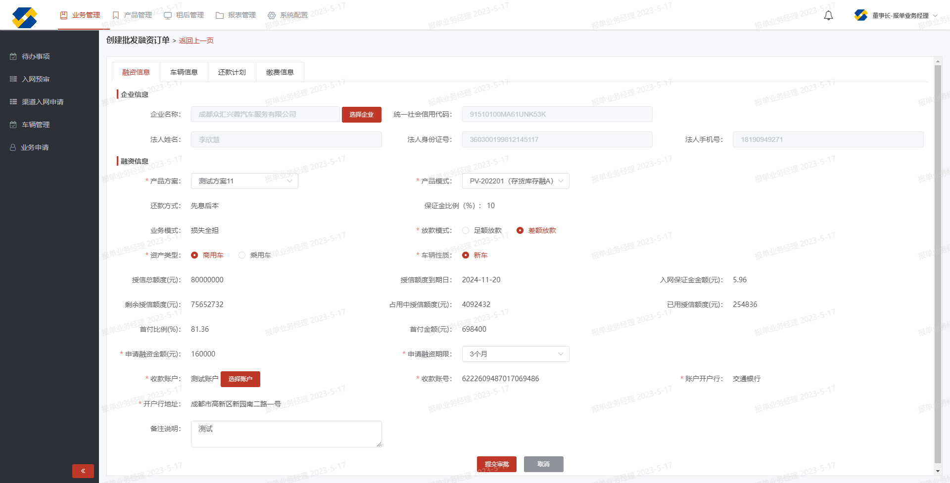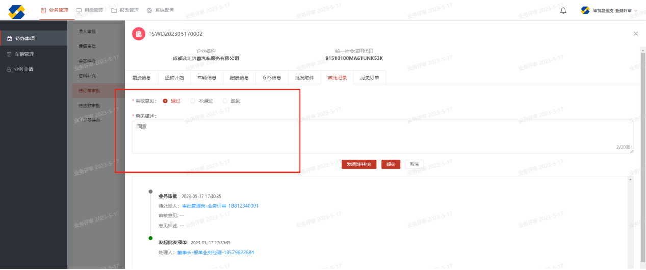 订单信息填写完成并确定信息正确后,回到“融资信息”页面,点击“提交审批”发起订单审批,此时订单状态为“订单审批中”。