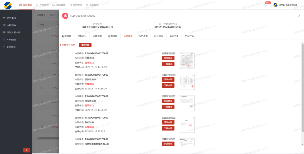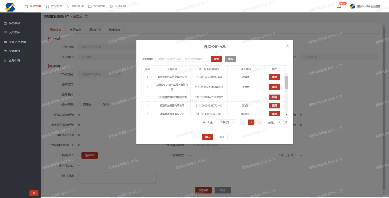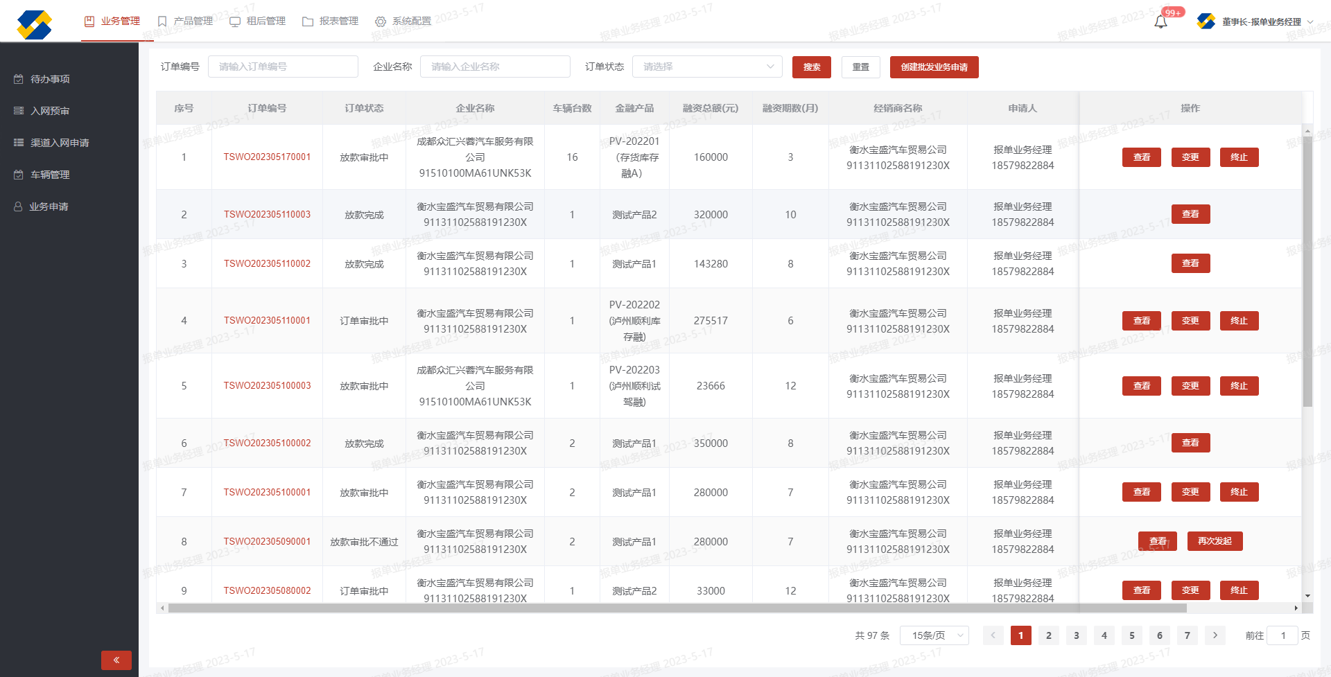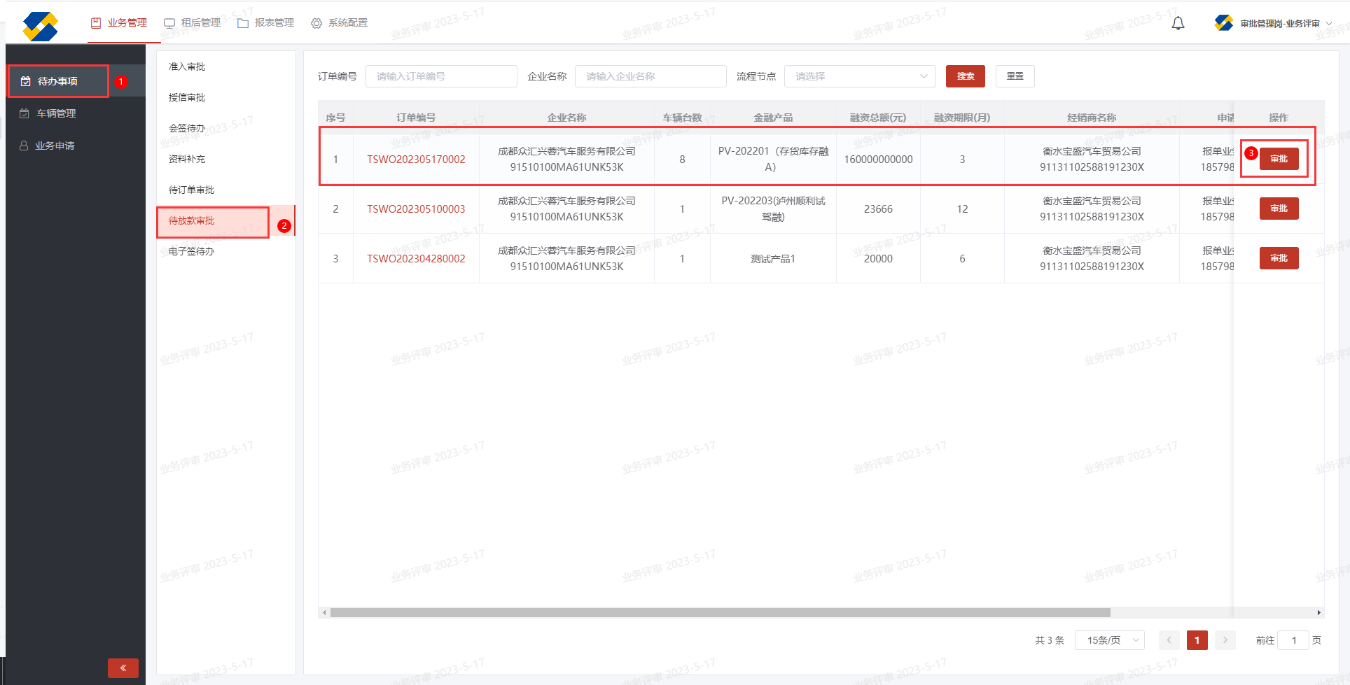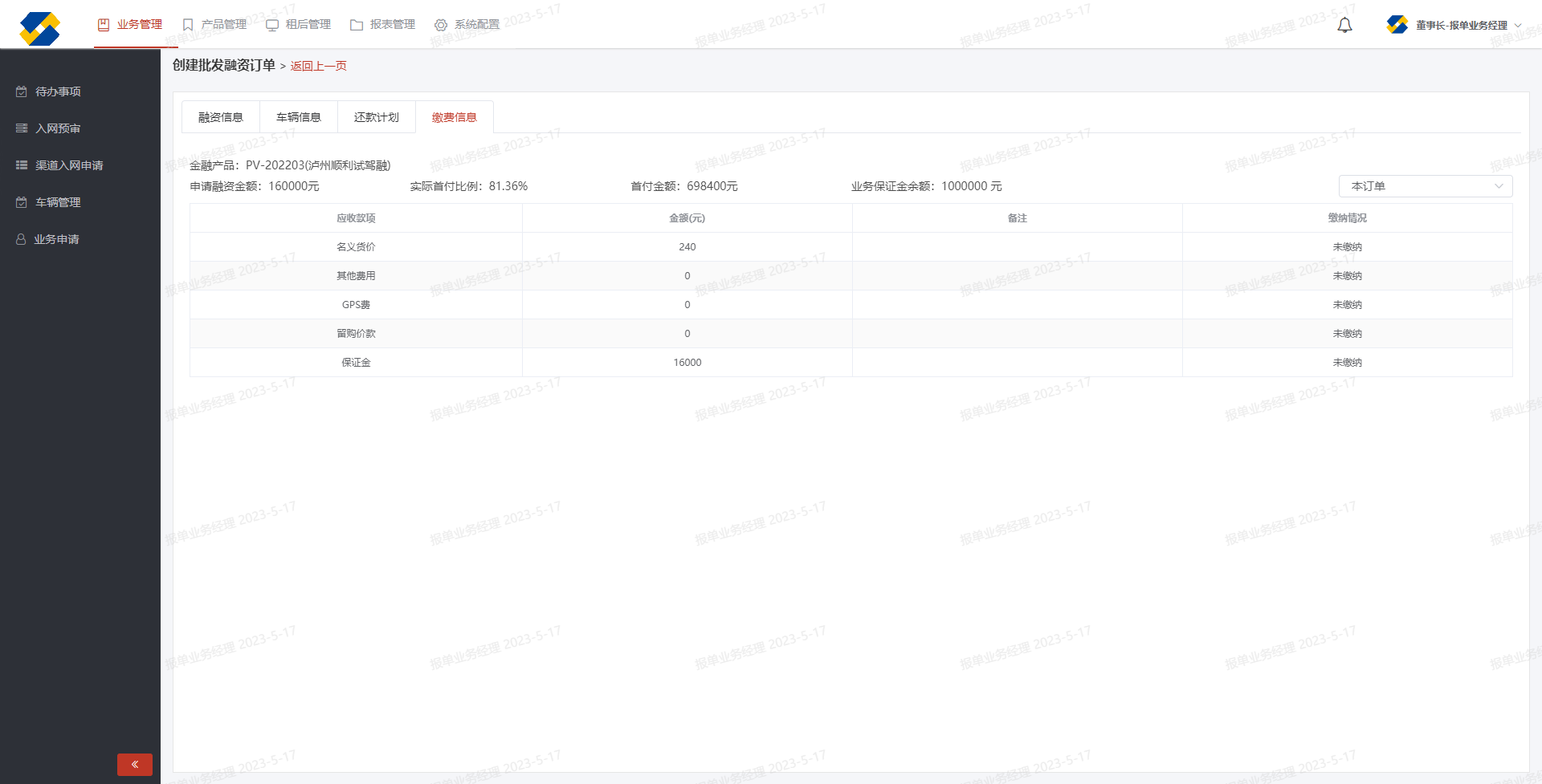 订单信息填写完成并确定信息正确后,回到“融资信息”页面,点击“提交审批”发起订单审批,此时订单状态为“订单审批中”。