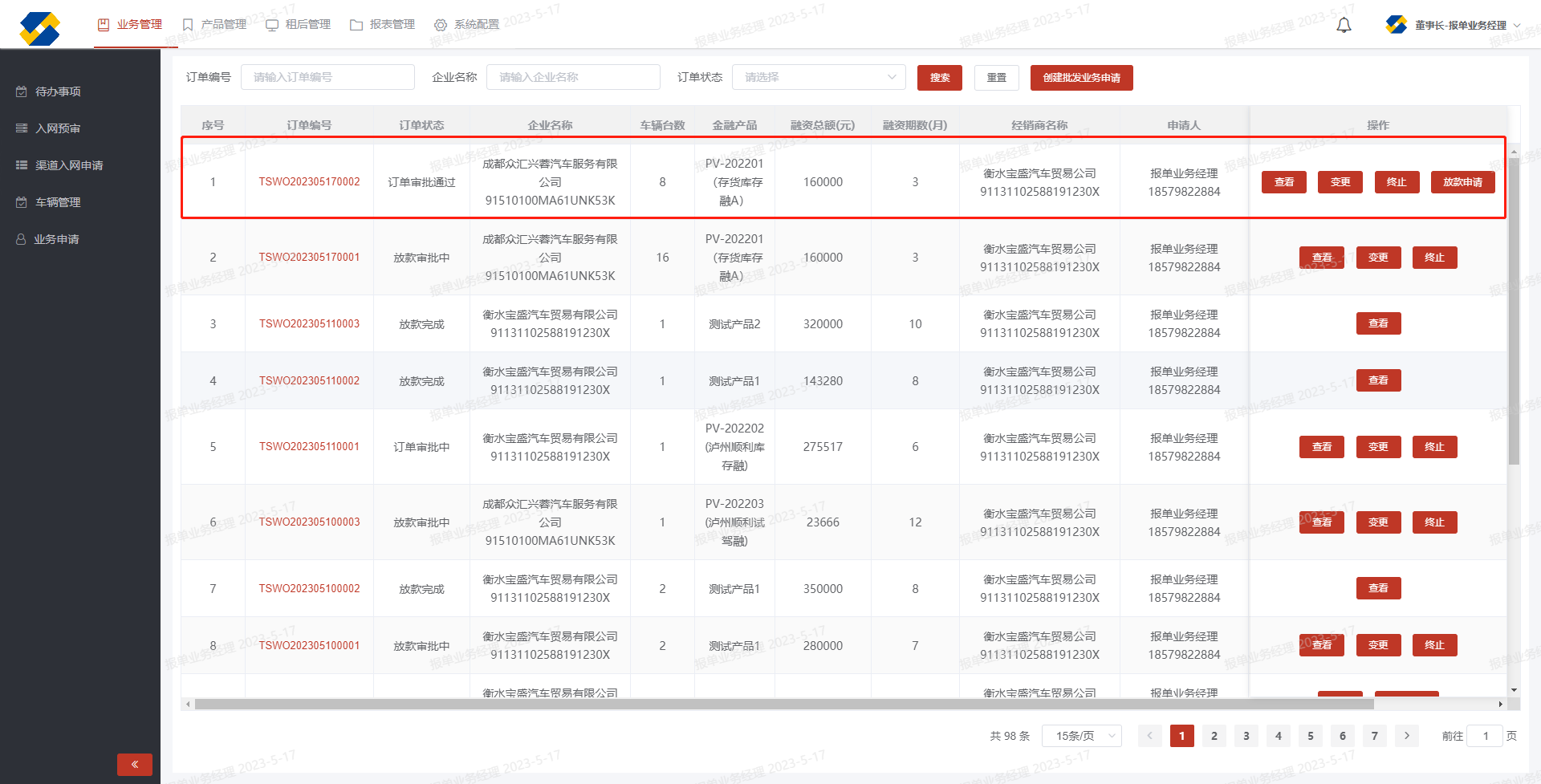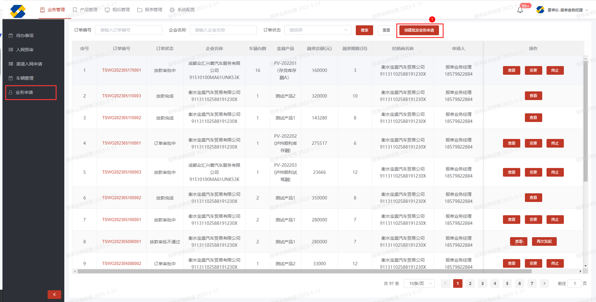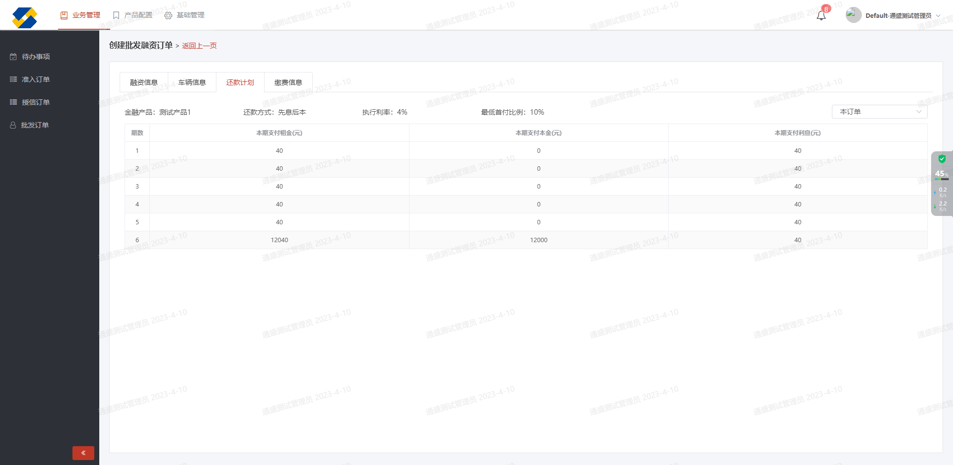 3、若订单状态为“订单审批通过”,成功创建了批发融资订单,可进行放款申请等操作。