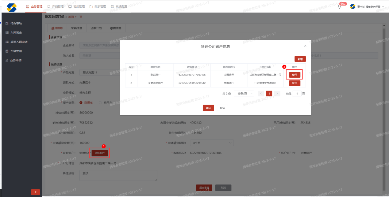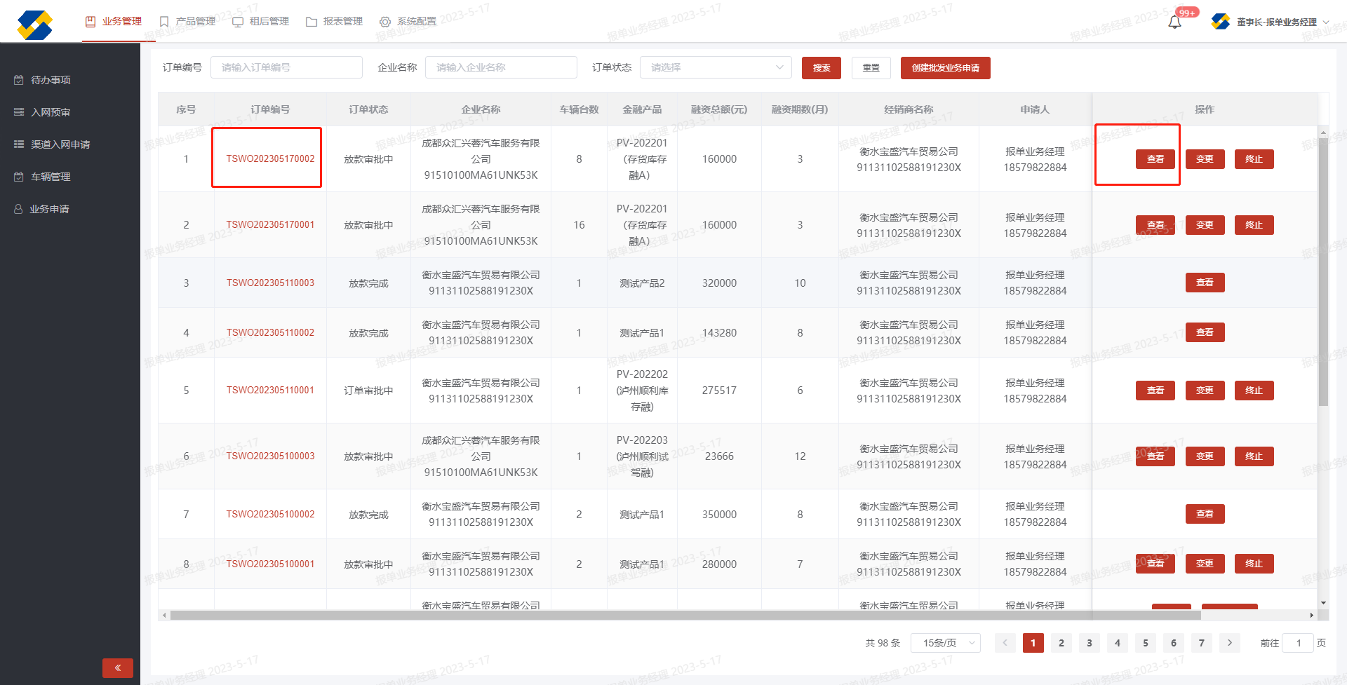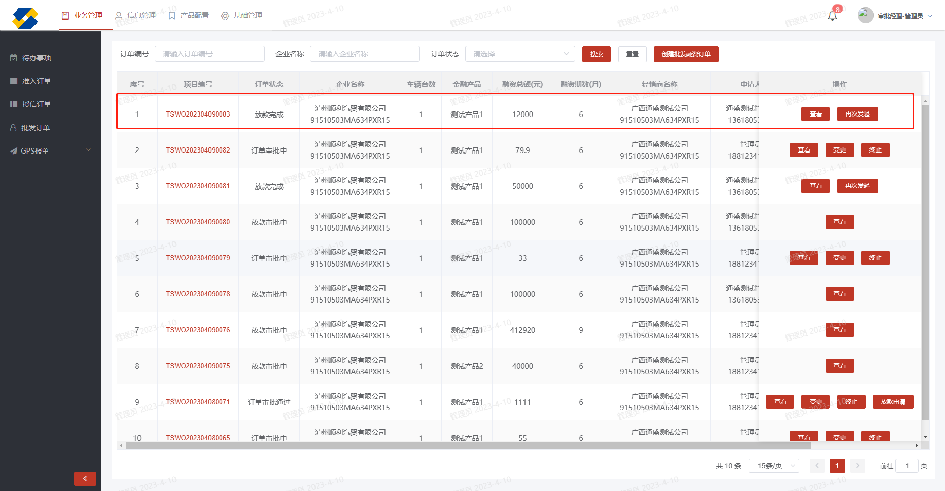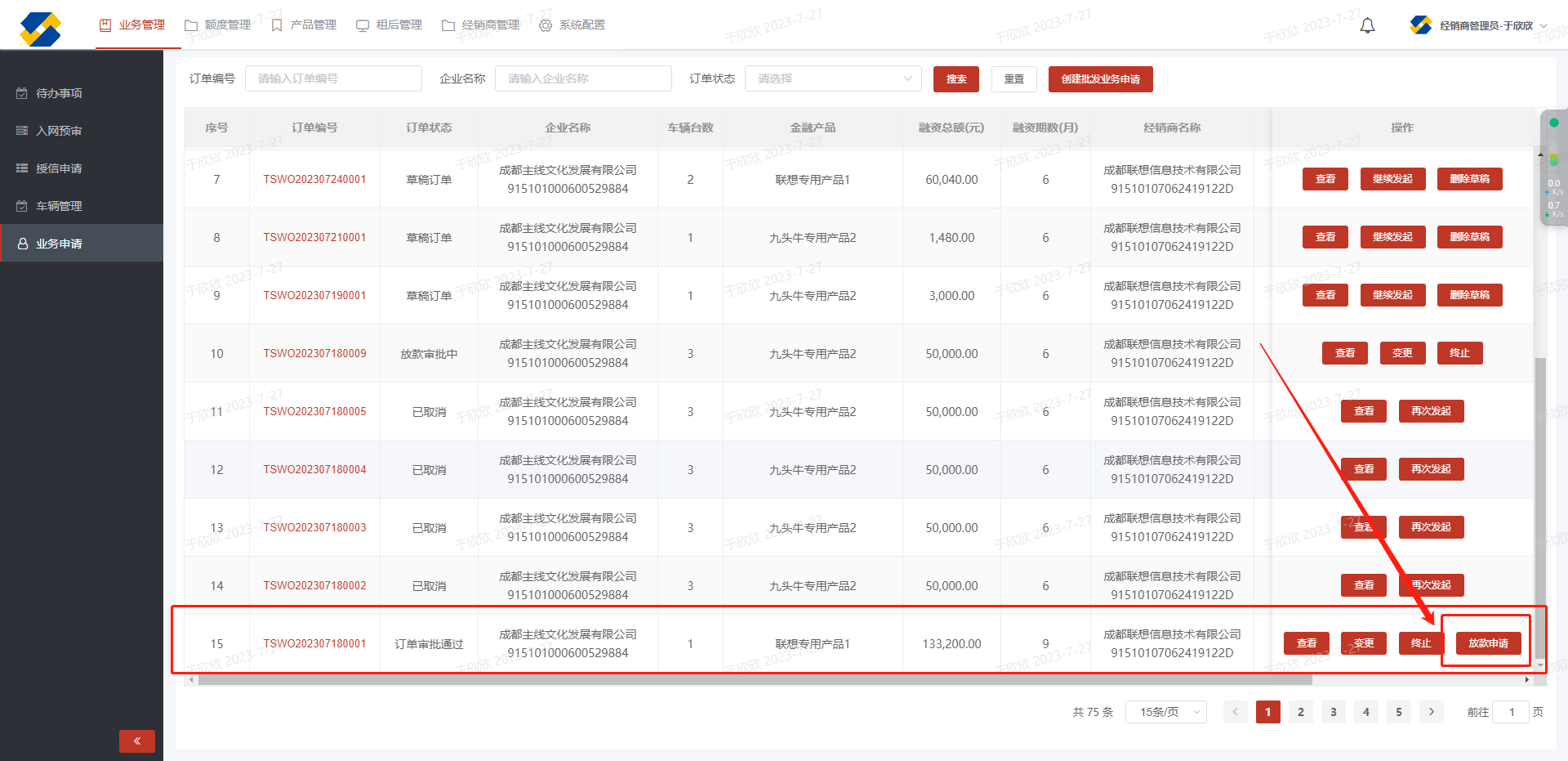 3、若订单状态为“订单审批通过”,成功创建了批发融资订单,可进行放款申请等操作。