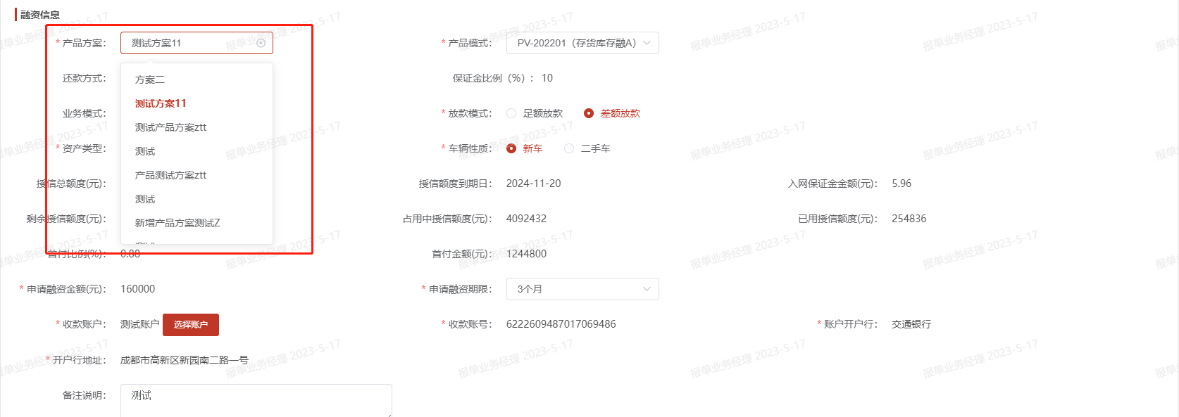 ①选择产品方案,产品方案为金融产品中配置的所有产品方案