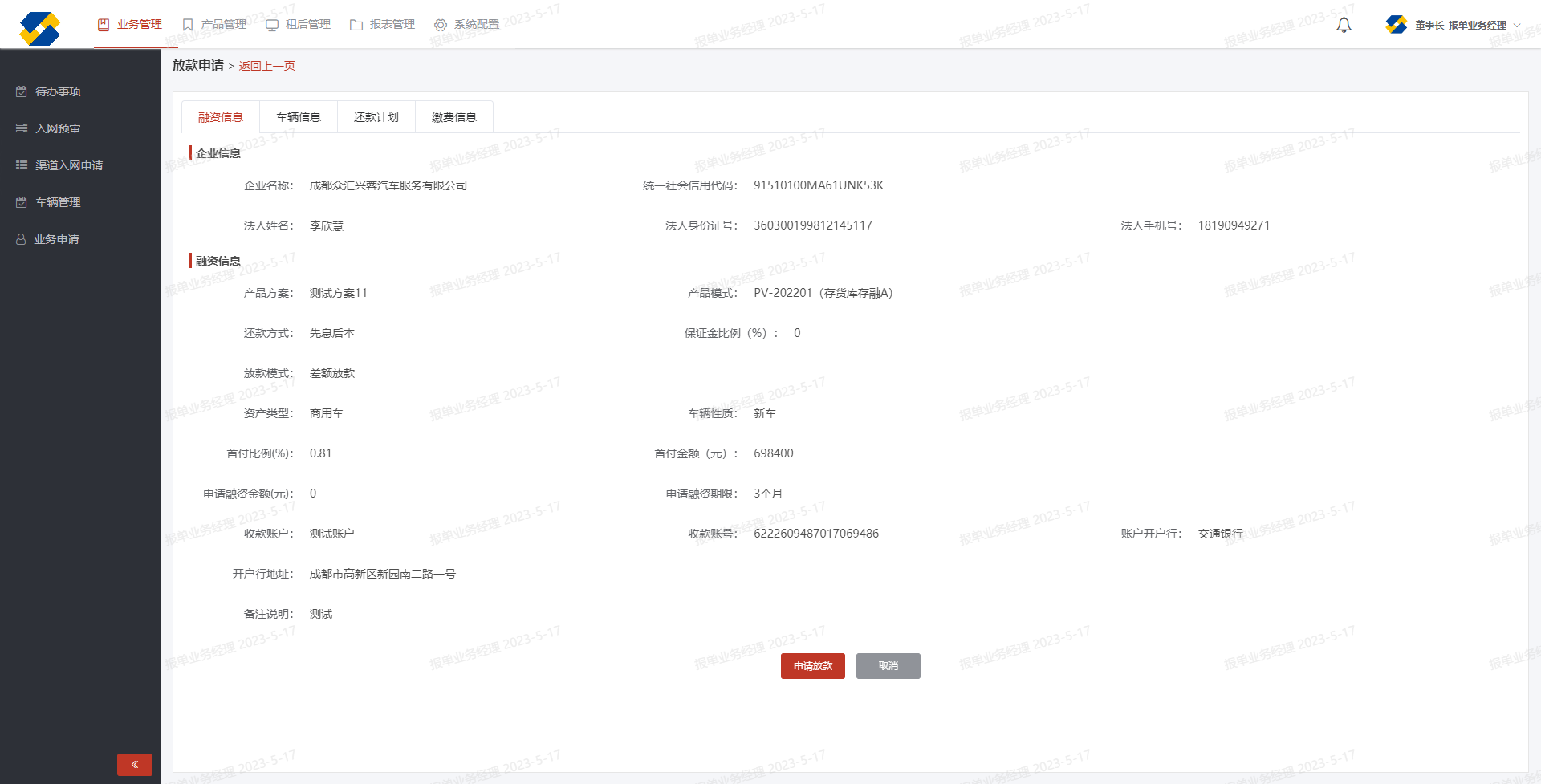 3、待租后确认缴费信息为已缴费,再次生成待办-待放款审批,审批人员在待办中填写“放款信息”,提交后则该订单放款成功,并推送批发订单档案。