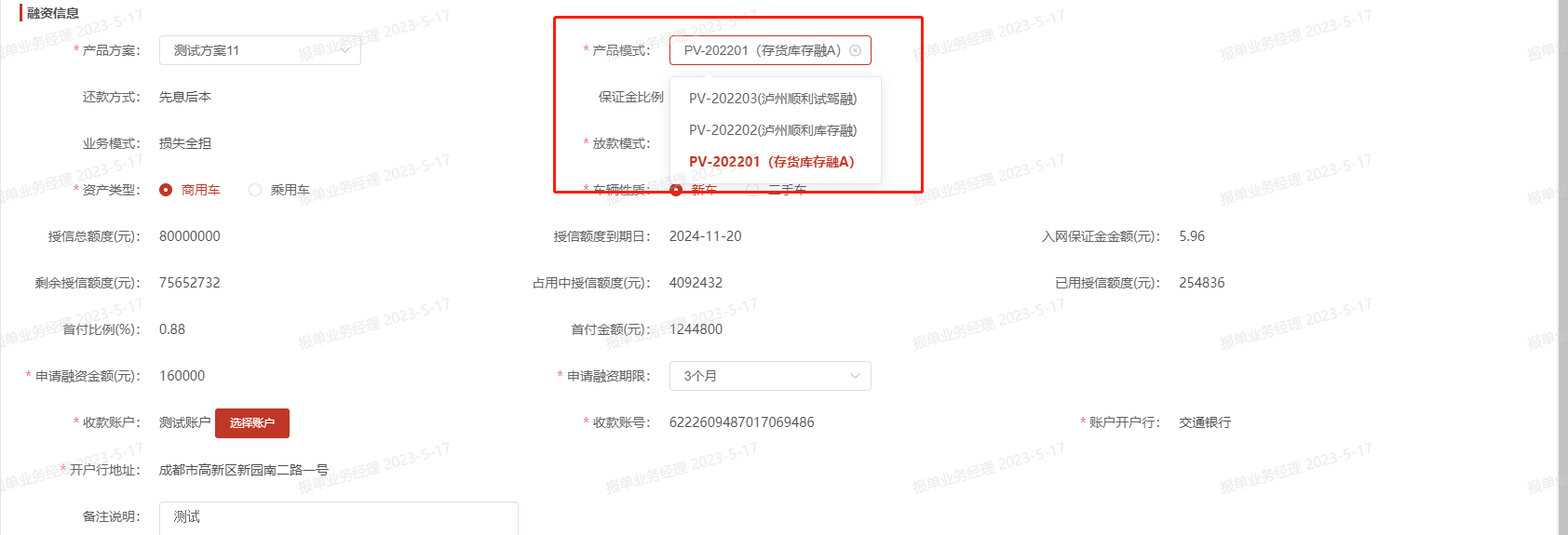 ②选择产品模式,产品模式为金融产品中配置在对应产品方案下的所有产品模式