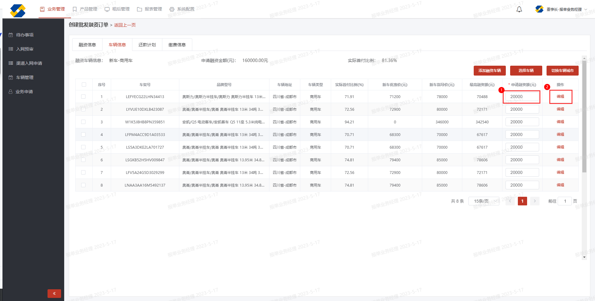 添加好车辆后,需填写需要申请的融资额,可对车辆进行再次编辑信息操作。