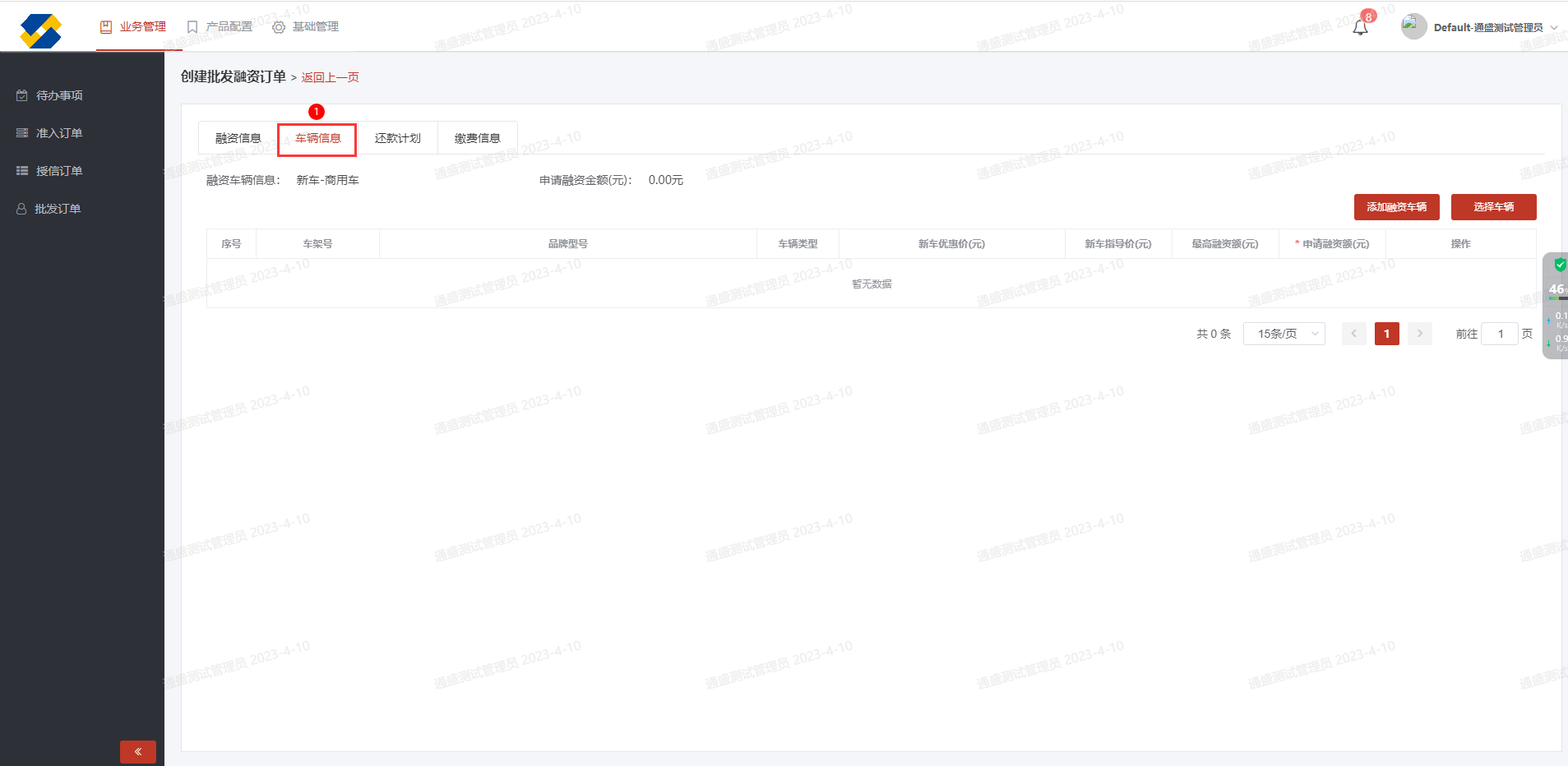 1、融资信息填写完成后,则点击“车辆信息”进行添加车辆