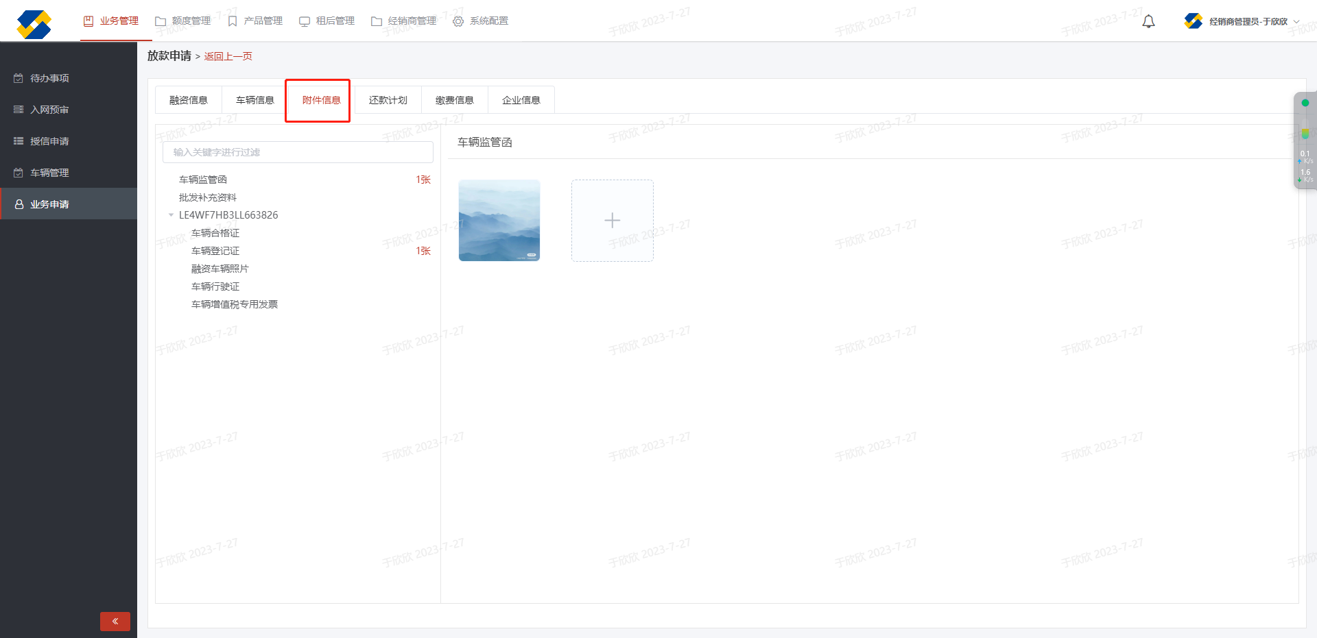在放款申请页面,点击“附件信息”tab栏,在此处可以上传放款申请需要用到的附件内容以及车辆的相关附件内容。