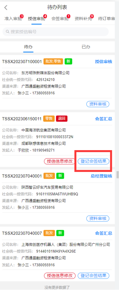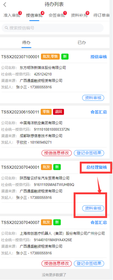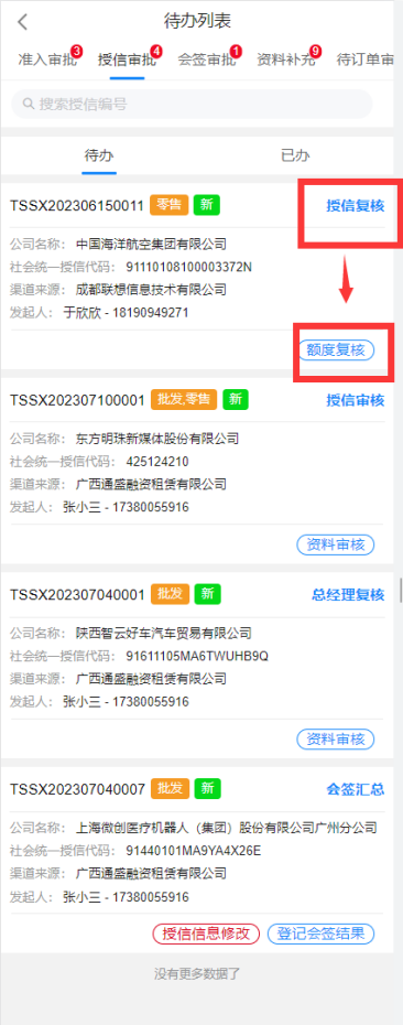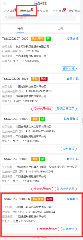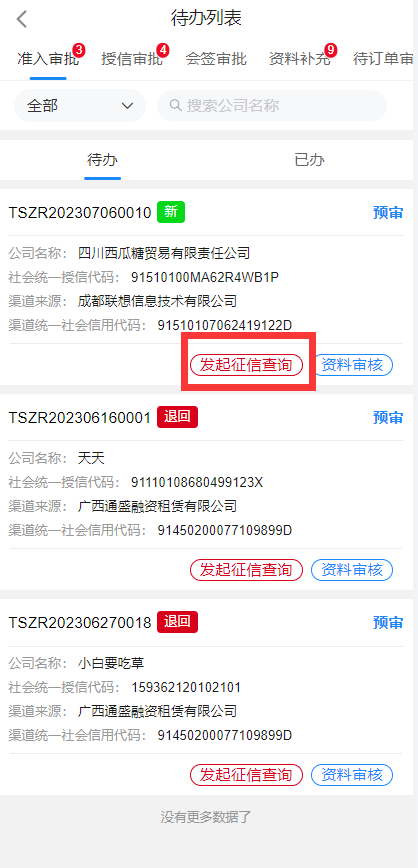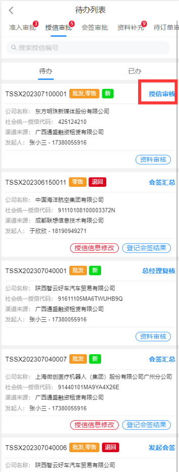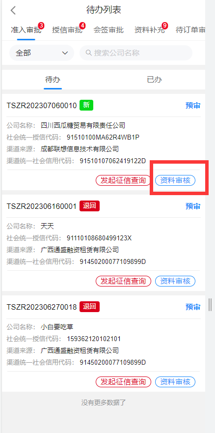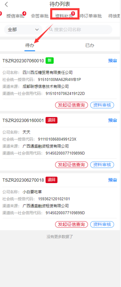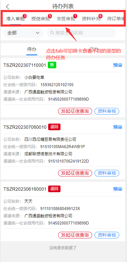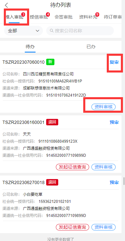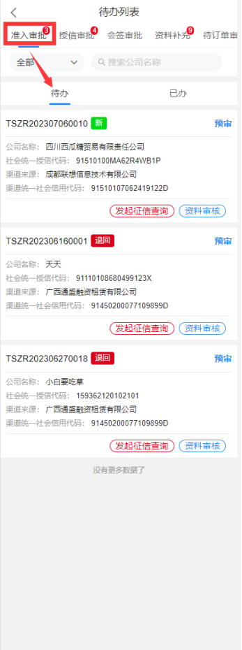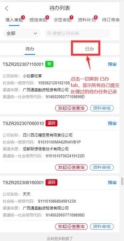 预审用户选择进入企业后,进入待办列表,列表中展示了该账号需要处理的审批,通过标识待办为新待办或退回待办便于审批人员区分待办类型;