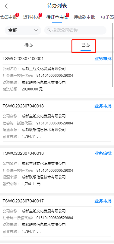 3、审批通过后,可以在已办中查看自己审批过的订单的审批记录。