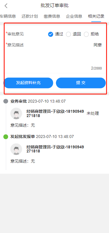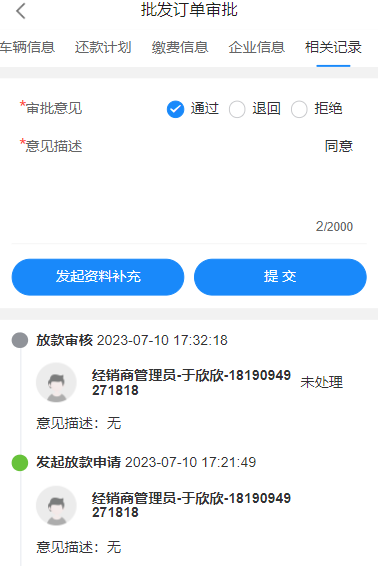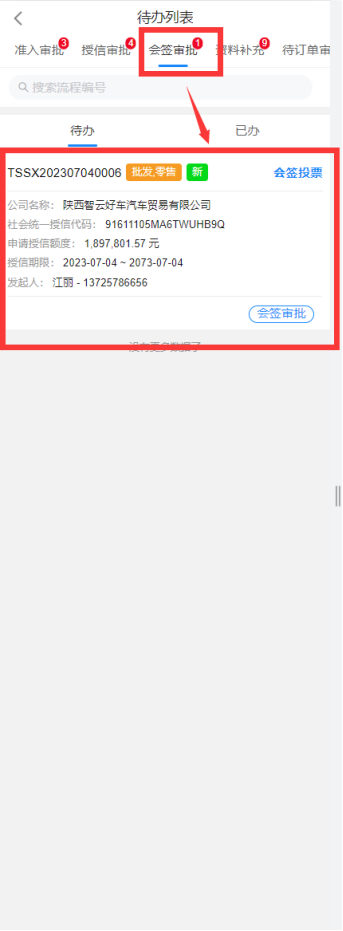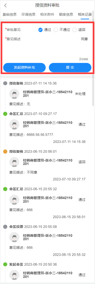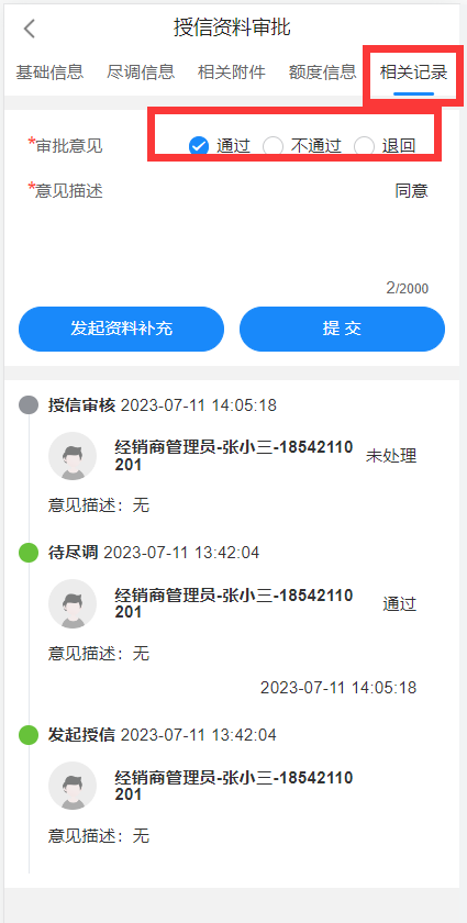完成征信查询后,审批员可在审批中执行通过审批,如有意见,也可填写对应的意见描述。在执行通过后,则该待办将流向下一个处理人。