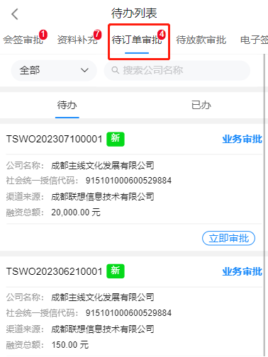 1、发起批发订单申请成功后,会在对应的审批人在待办列表页面生成“待办-待订单审批”,如图:
