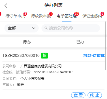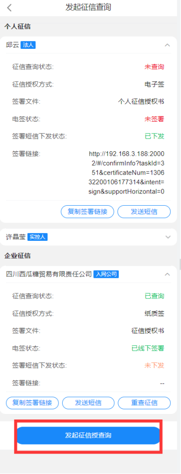 在审批人员点击发起征信查询后,将同步对个人发起电签授权、企业发起征信查询;列表上可以实时看到短信下发情况、授权签署情况及征信查询情况;