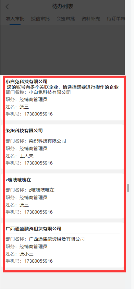 待办列表显示所有当前登录账号需要处理的待办任务,当一个账号属于多个企业时,在进入待办时,需要选择进入的企业