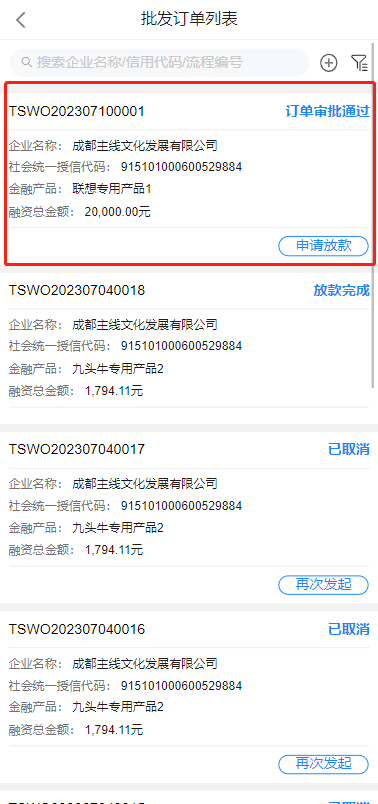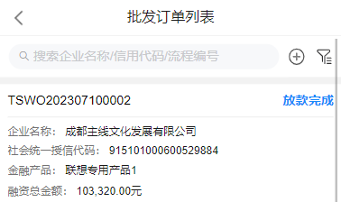 4、订单审批全部通过后,订单状态变为“订单审批通过”,可在批发订单列表查看,后续可进行放款申请等操作。