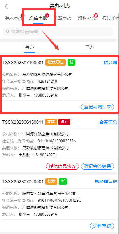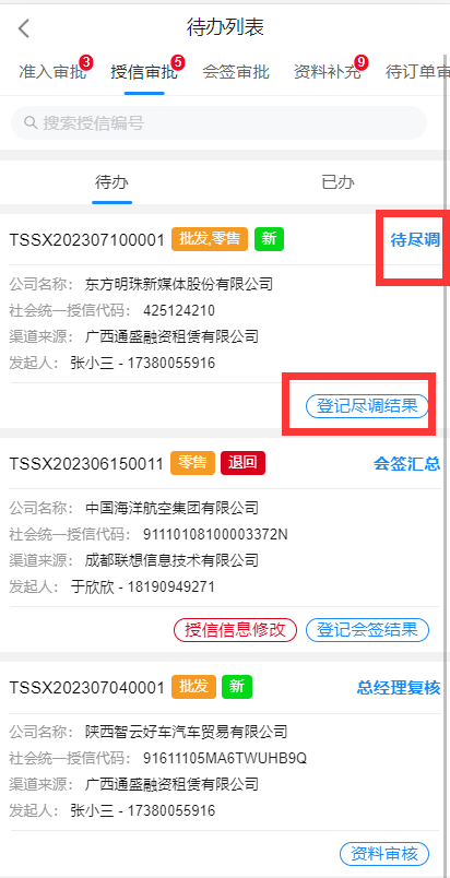 第一个审批节点是尽调,尽调岗的人职责是录入线下现场调查后的尽调报告结果。而能够收到这个待办的人是在分单规则中配置的指定人,登录后会看到这条待办;