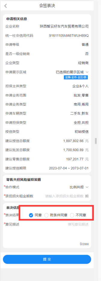 会签人员需要根据相关的资料,对前面领导都审批通过的建议授信额度和保证金比例发起投票,投票分为同意和不同意。