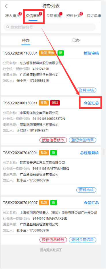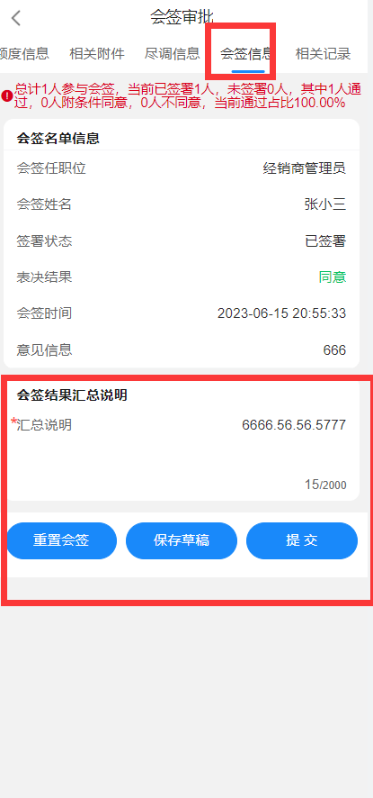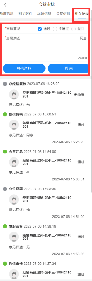 后面节点的人就是层层审批,如果认为有资格就通过,如果没有资格,就拒绝,如果认为填写的建议额度太高,则可以退回。当风险分管副总同意之后,则流程进入到下个节点,发起会签