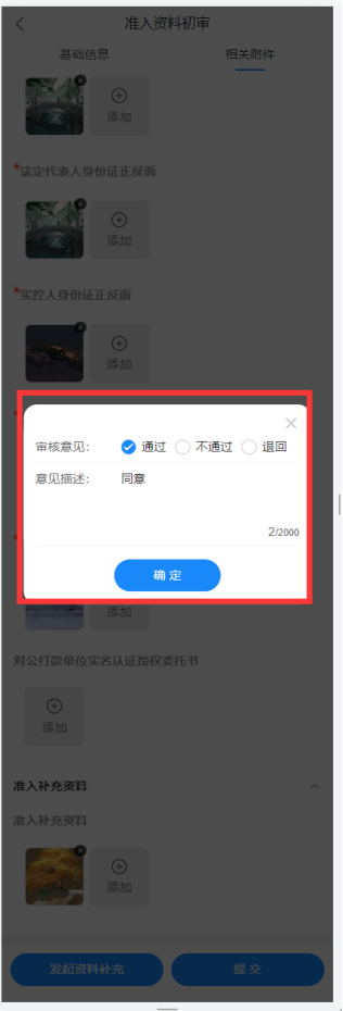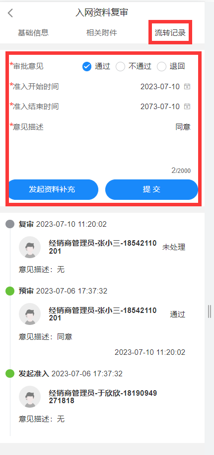 在复审环节,审批人员的职责主要是对预审审批通过的资料执行二次资料检查、风险评估,以作为审批的参考依据。二次检查包含审查基本信息、附件信息;风险评估包含查看征信报告、企业历入网记录。征信报告中展示了执行完征信查询的个人征信报告及企业征信报告,如果存在企业或个人征信报告结果未查询出的情况,则可在基本信息中对应重新发起征信查询。企业入网记录中展示了该企业历史的准入情况及准入变更情况。