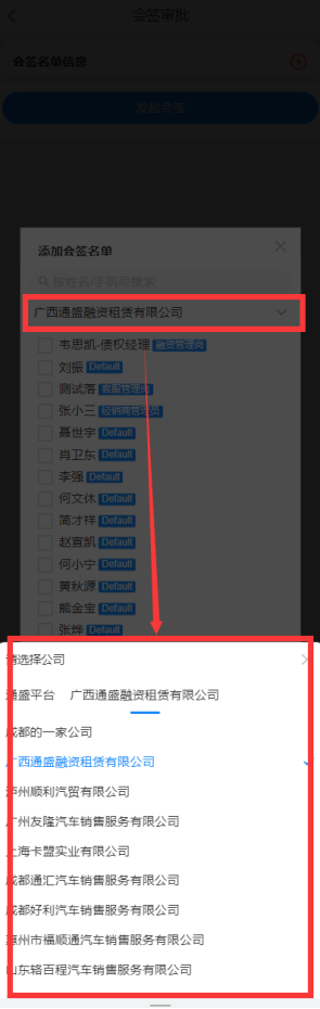 投票人员入口发起是通过添加会签名单图标,系统会获取所属公司下的所有部门及对应人员,用户根据业务需要去勾选对应的人员。