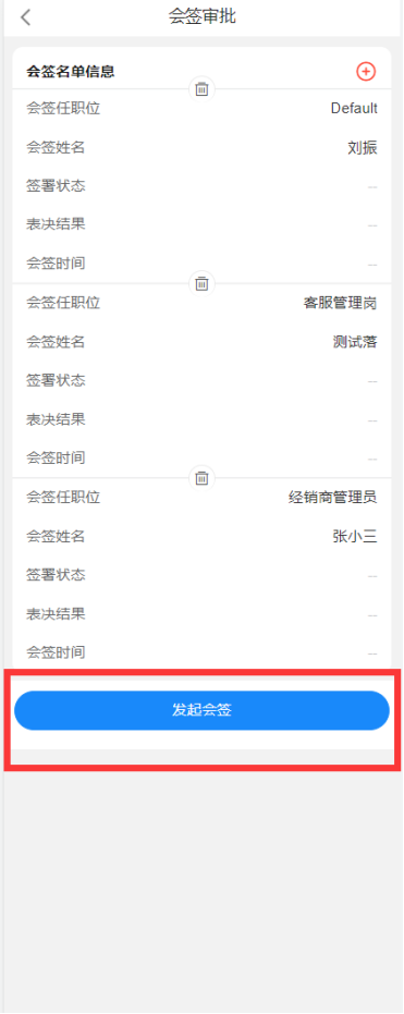 勾选后的人员将在会签列表中显示,确定好人员后,就可以发起会签待办,让会签人员执行投票;