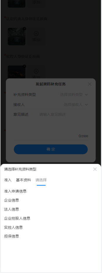 也可以通过补充资料功能,对需要更新的资料进行勾选,如果需要提供额外的其他信息,则可以在文本框中备注需要提供的额外资料信息说明;执行资料补充的接收人默认匹配对应的经销商/代理商人员,提交补充任务后,对应人员将会资料补充的待办下收到需要补充资料的待办;