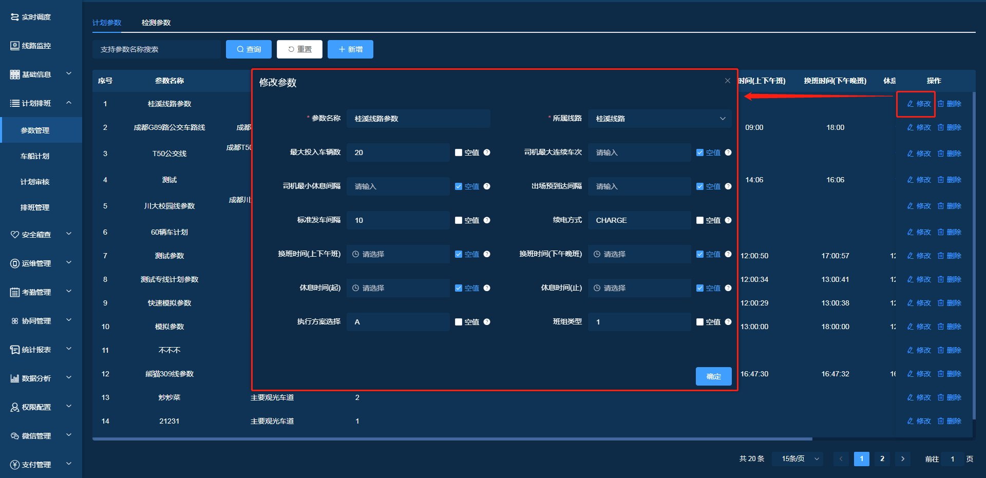 参数管理用于配置满足企业营运要求的基本项。计划员根据历史运行情况,配置满足高、低峰段的发车间隔和最短、最长停站时间。配置的指标参数是企业执行营运任务的标准。