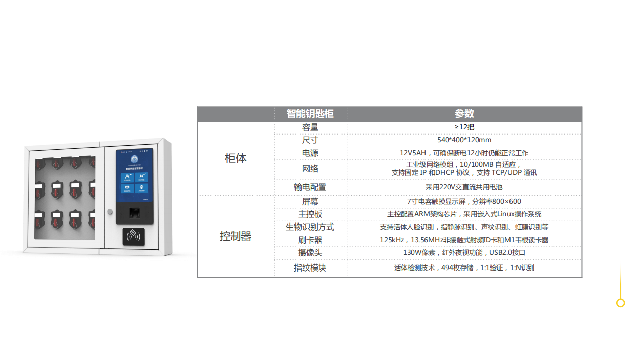 产品介绍 智能钥匙柜柜体配备指纹仪、IC卡阅读器、屏下摄像头7寸触控屏,用户通过指纹、IC卡进行身份认证,每个钥匙均通过唯一的标签进行标识。主要功能包括钥匙领取、钥匙归还、钥匙柜设备管理、视频监控、安防报警、视频对讲、 远程监控、远程操作、远程设置、远程升级、用户管理、日志 报表、统计查询等功能。 功能特点 检测流程 1.钥匙领取 2.钥匙归还 设备参数 文档更新时间: 2022-07-08 09:55 作者:admin
