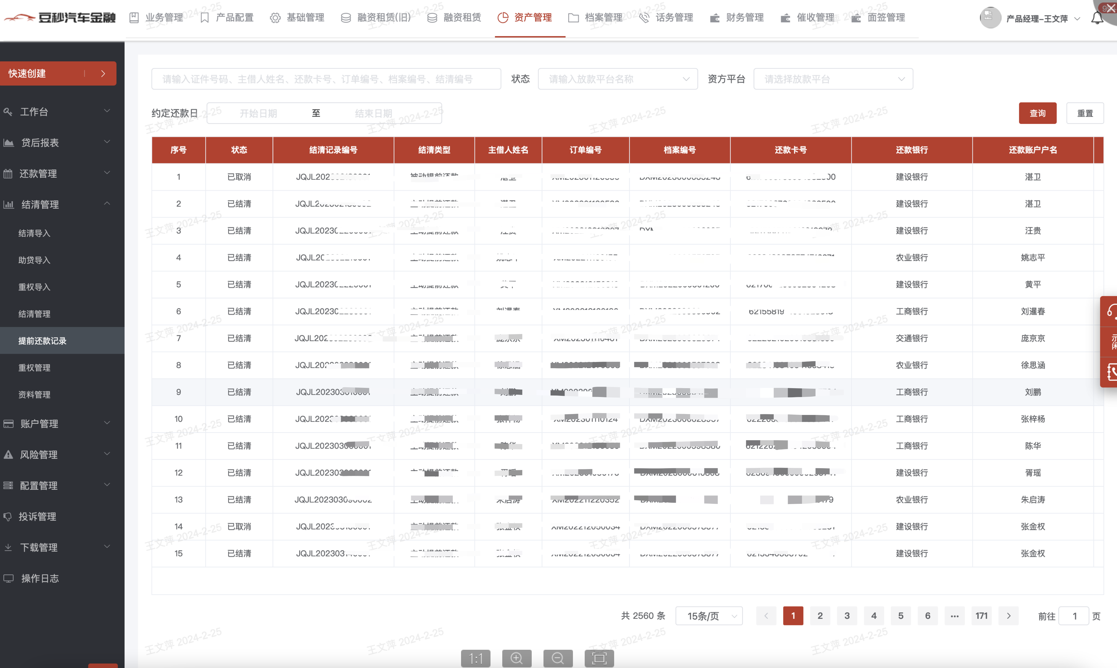 1、模块说明:贷后产生提前还款的订单可以在此查询,该模块主要是中铁建、国银的提前还款数据;