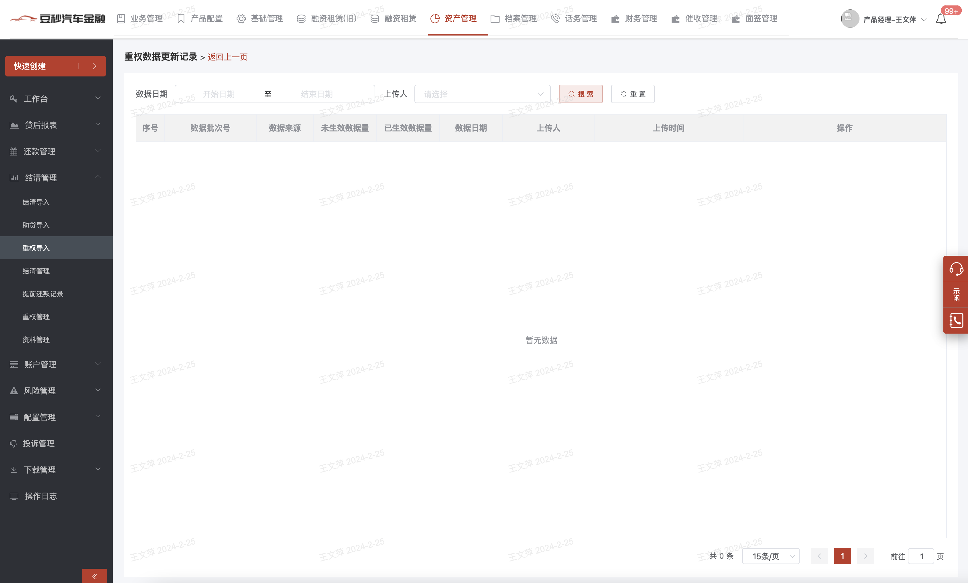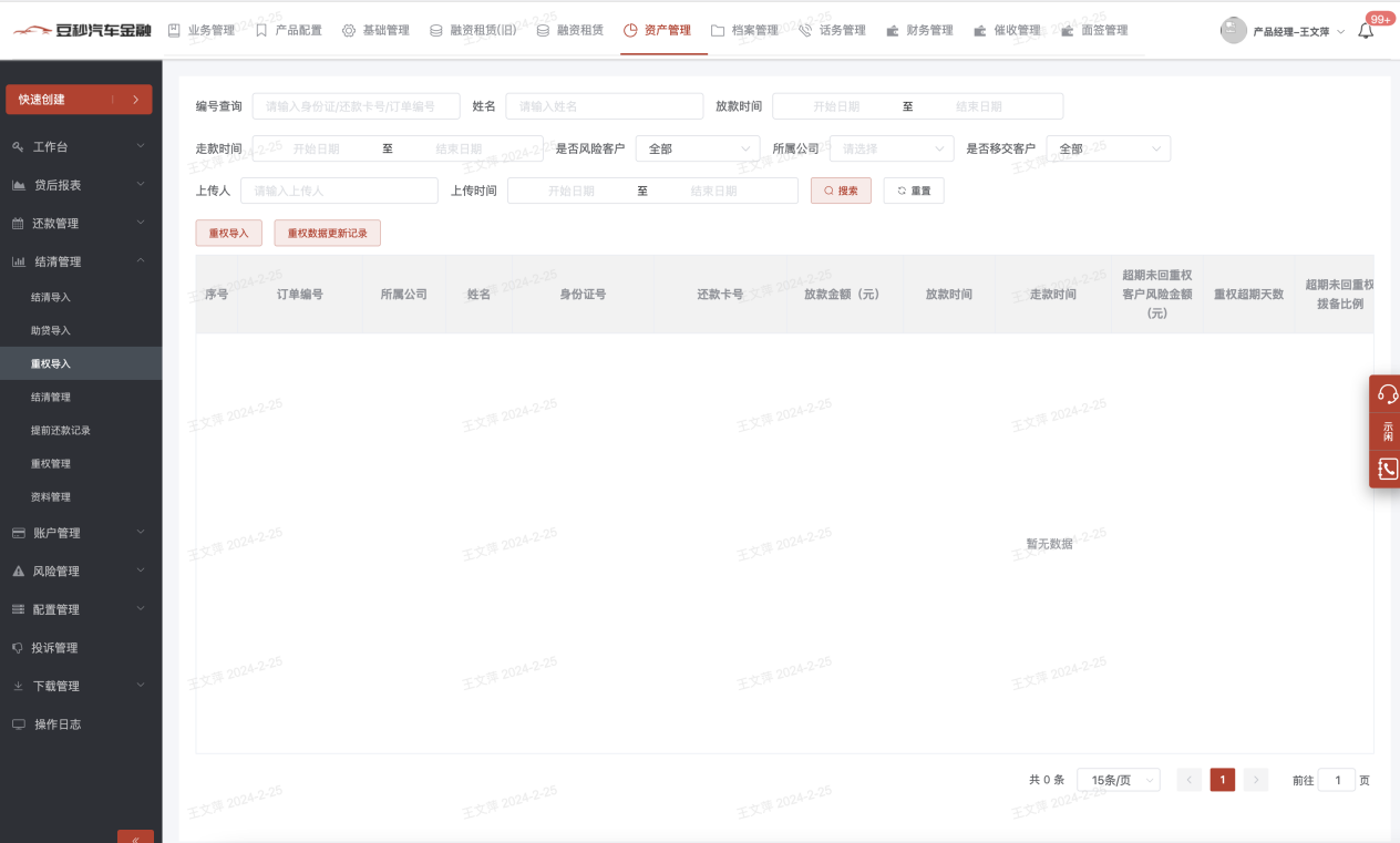 1、模块说明:贷后产生重权的订单可以在此导入查询,该模块主要用户报表取数;