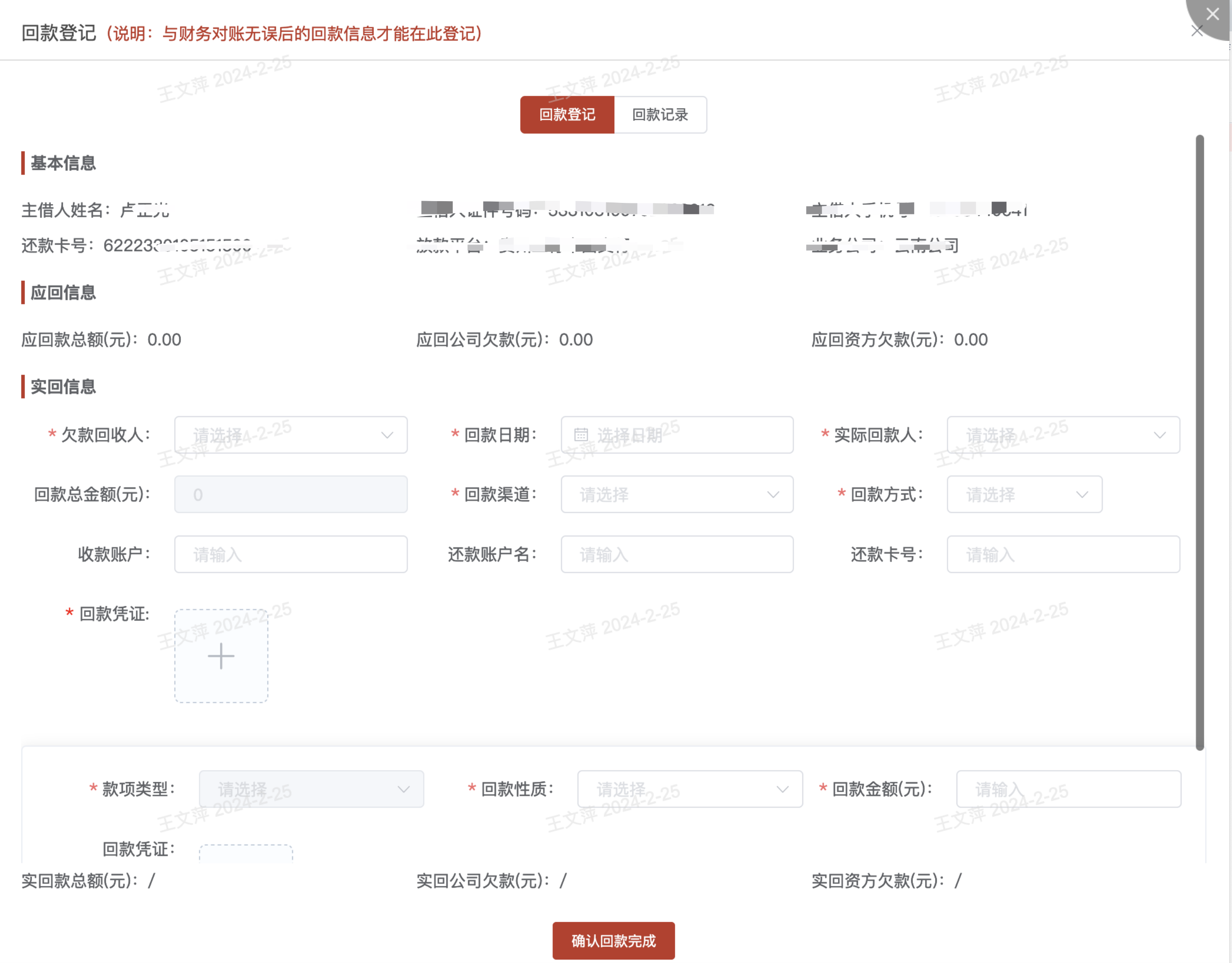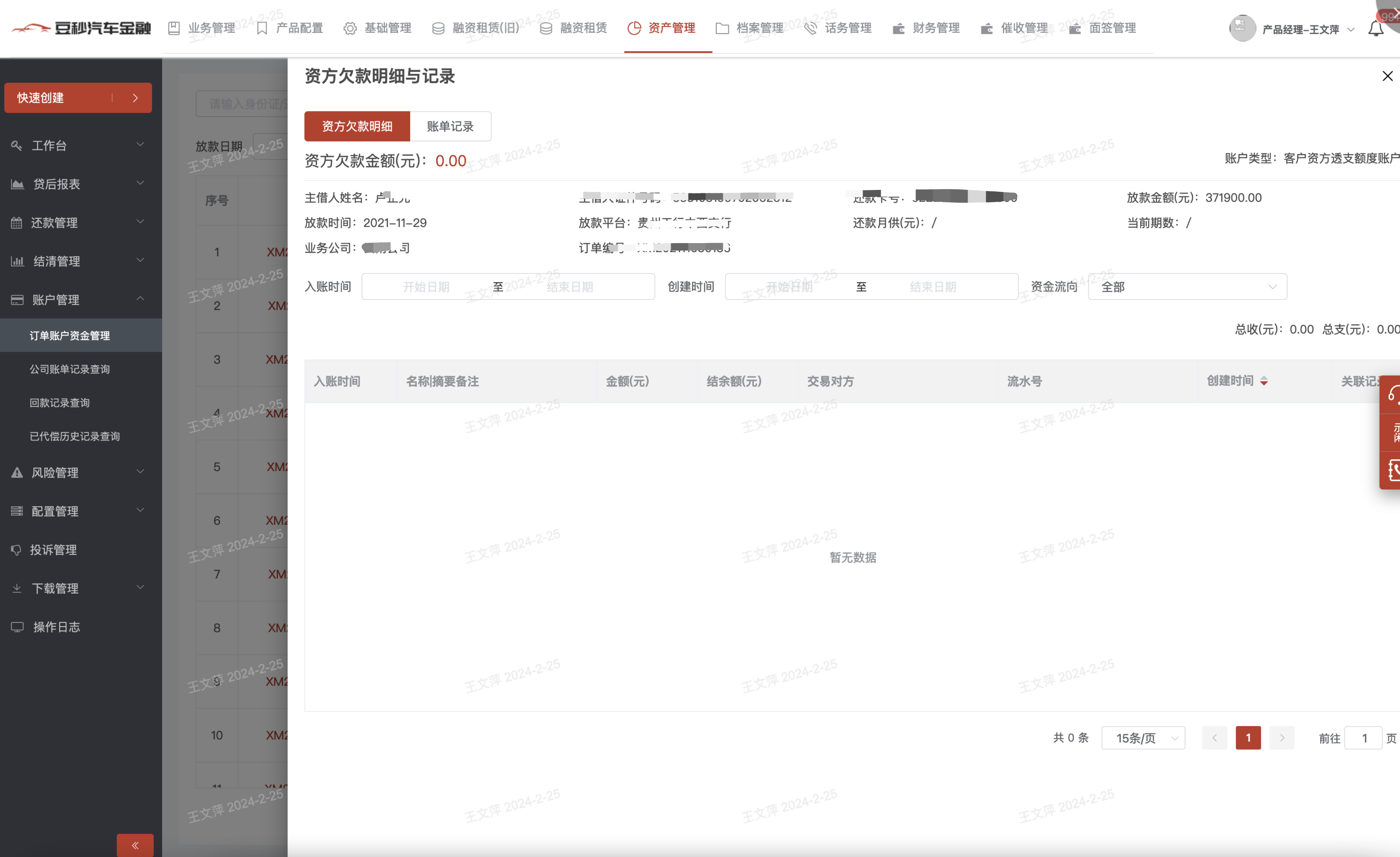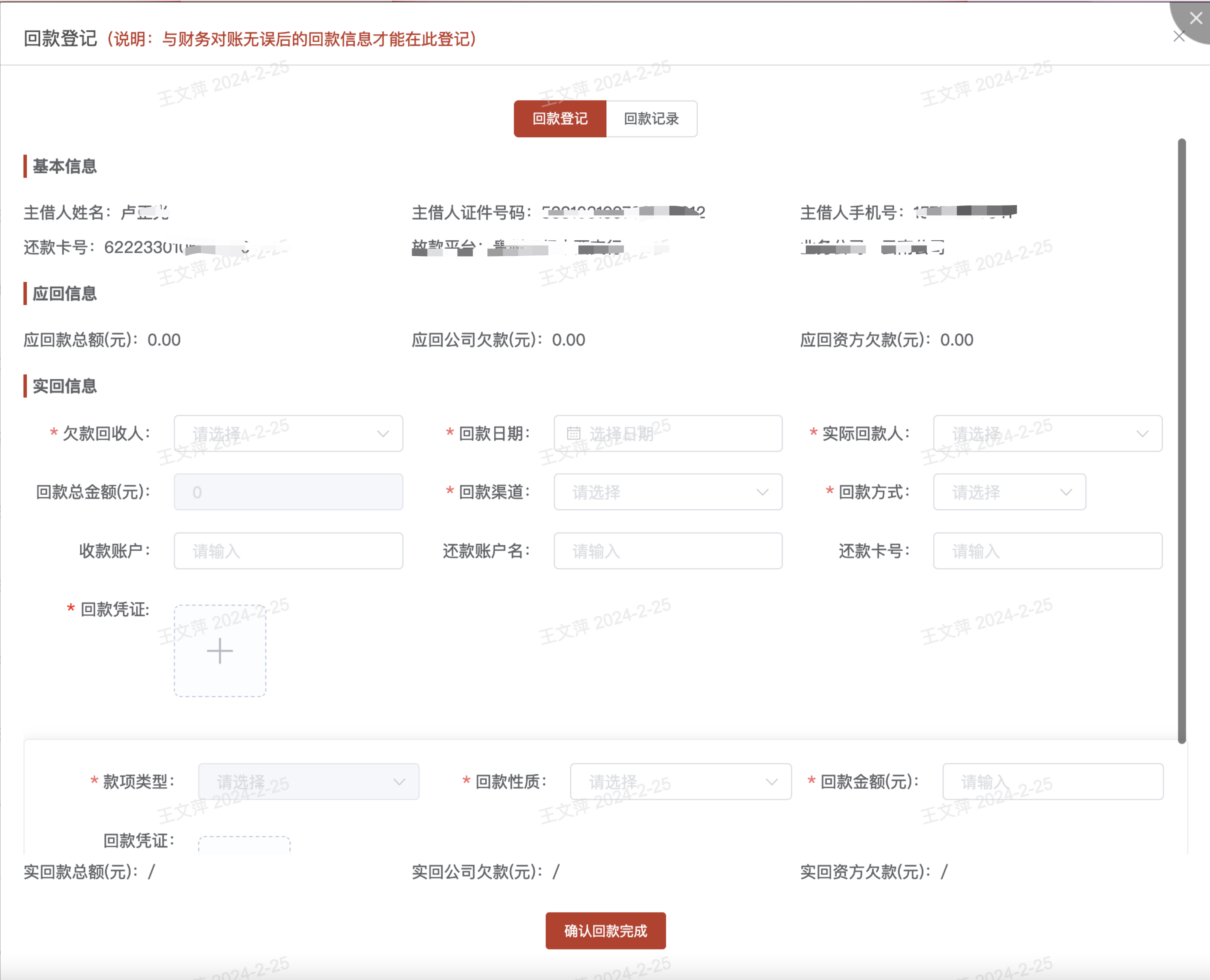 e)资方欠款:点击支持查询明细与记录、回款登记;