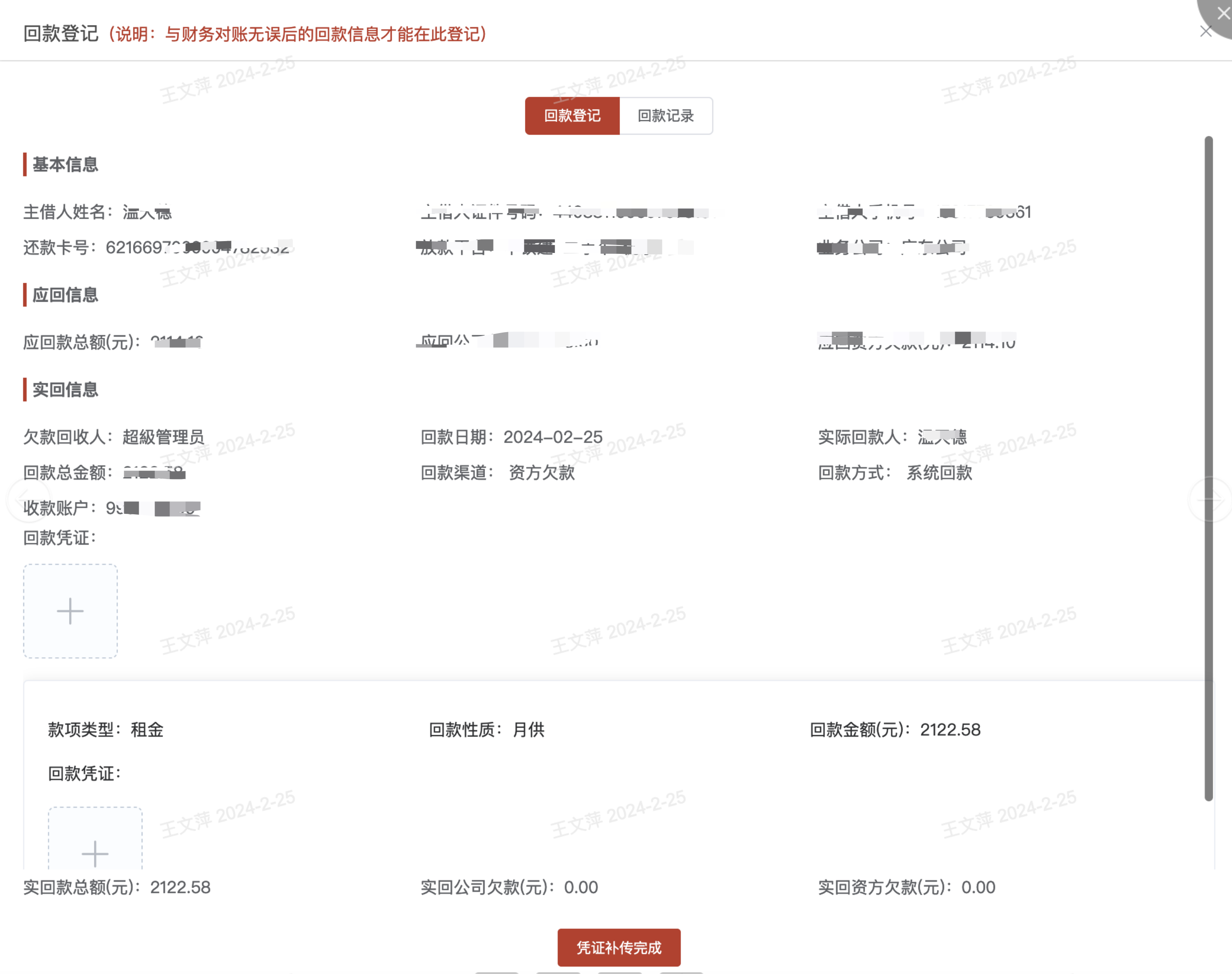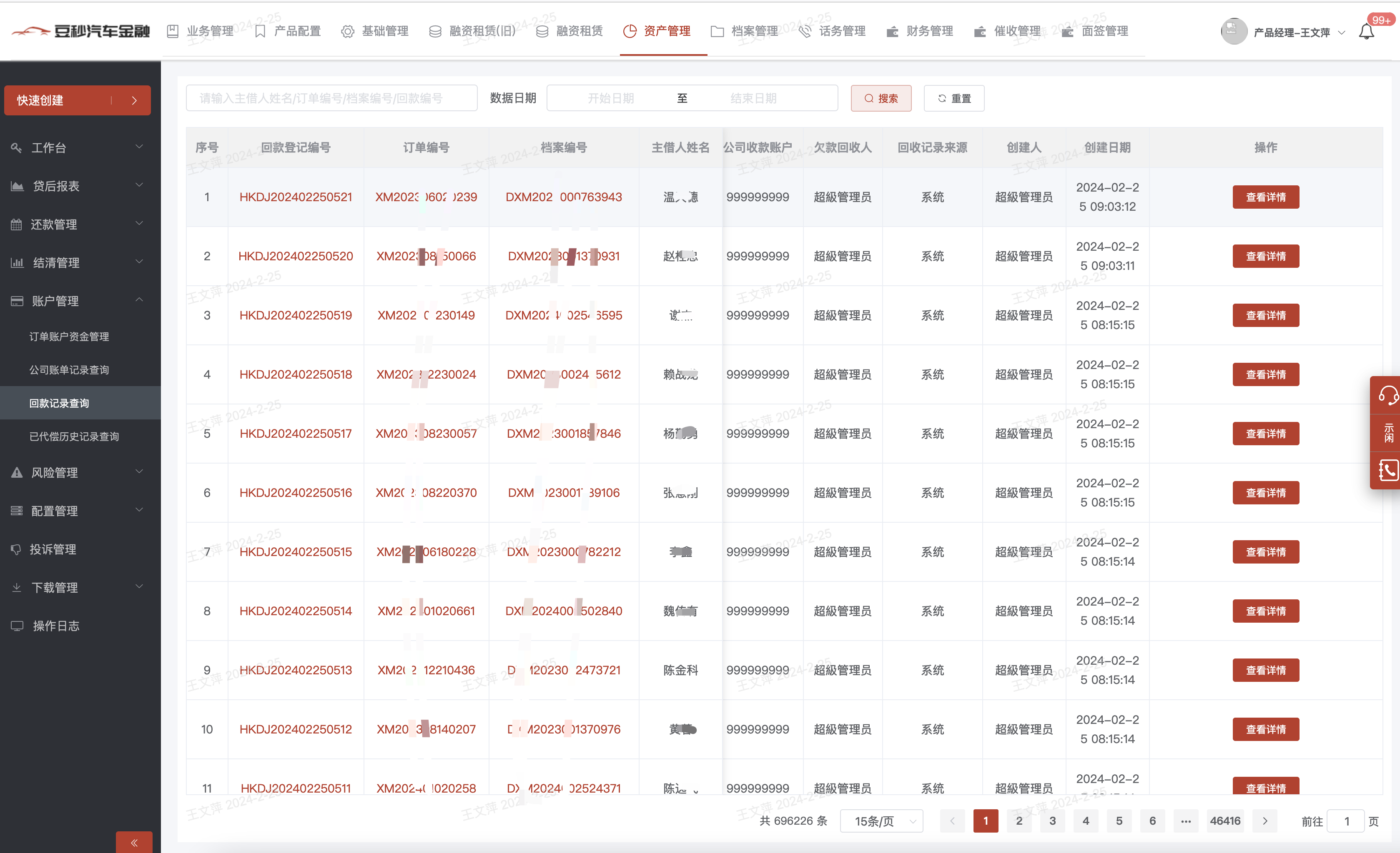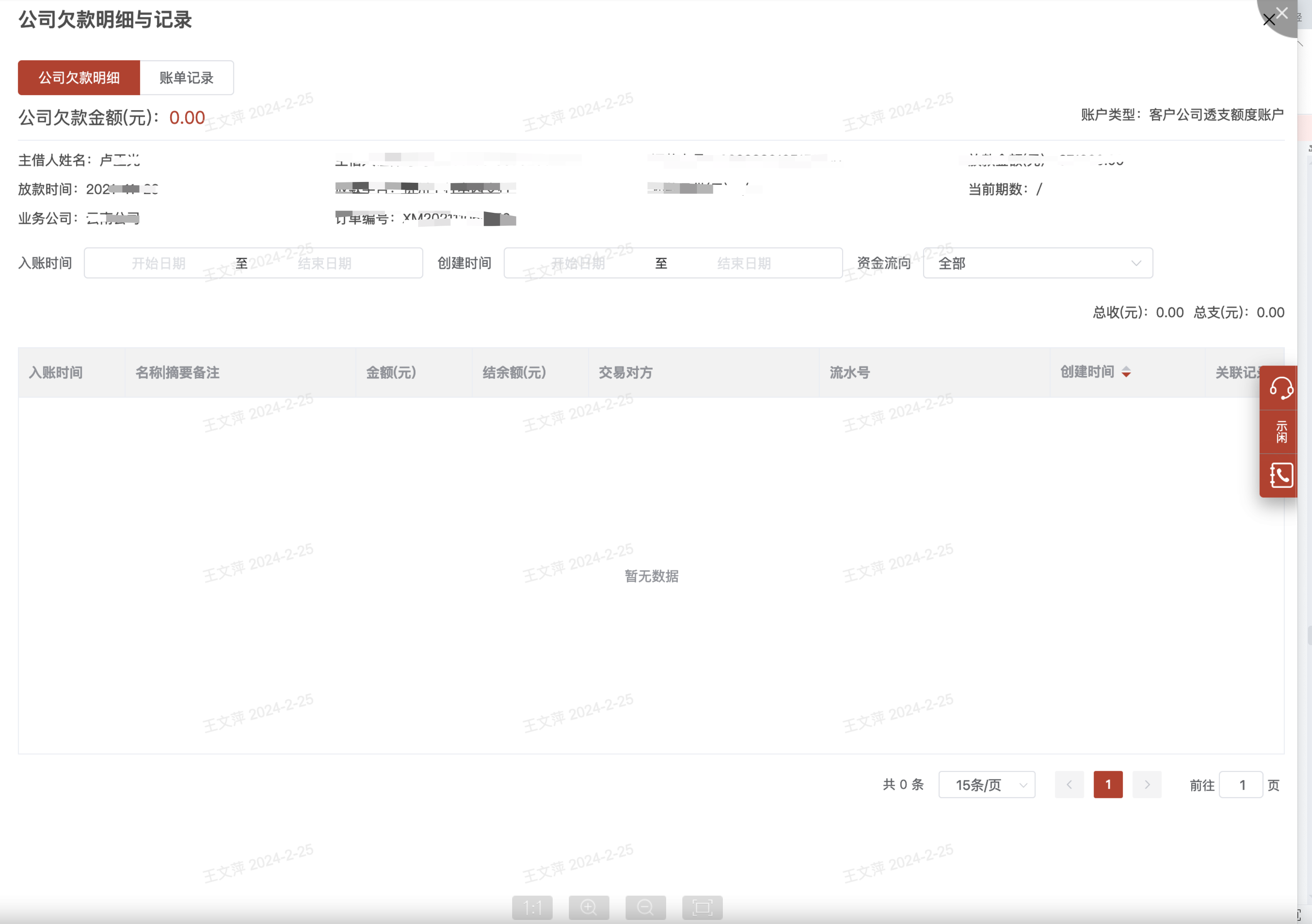 e)资方欠款:点击支持查询明细与记录、回款登记;