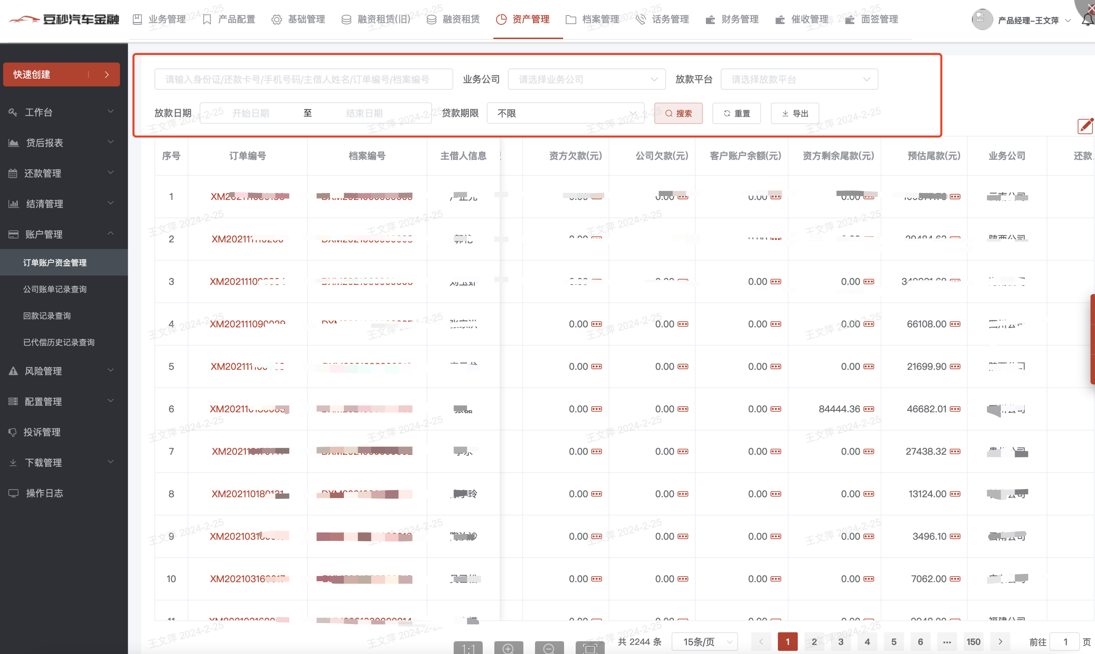 3、搜索区域:支持综合搜素、业务公司、放款平台、放款日期范围、贷款期限进行搜索;