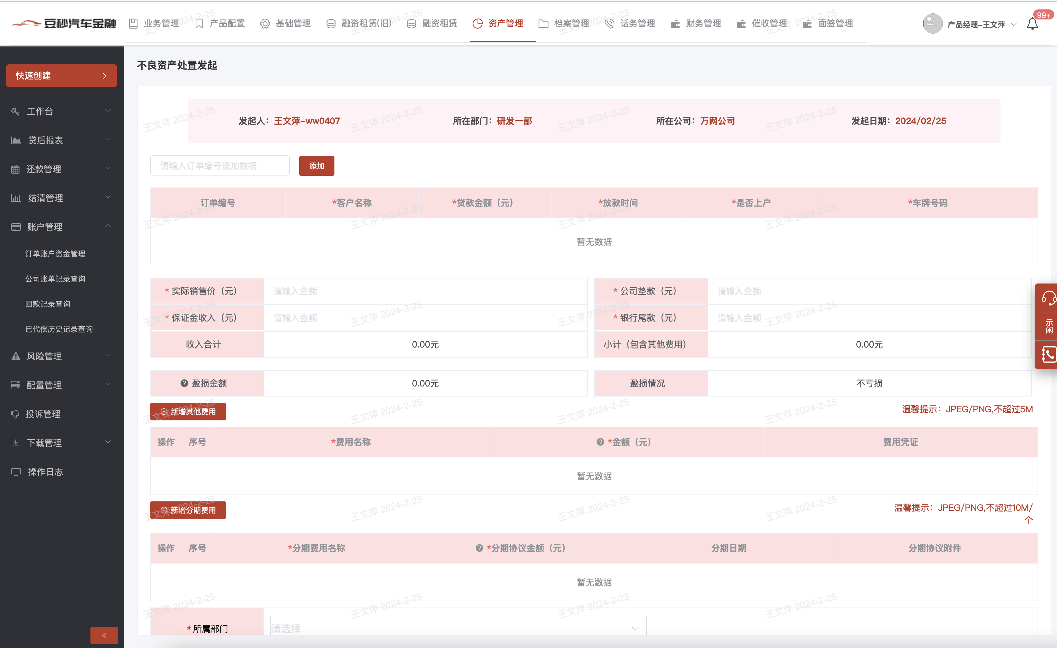 1、模块说明:支持发起不良资产处置流程,发起后触发OA审批流程,流程审批通过后该订单结清;2、填报内容:a)支持输入单个/多个需要发起不良资产处置的订单编号;b)根据要求填写费用信息、分期费用信息、自己所属部门信息;c)填报后由业务公司负责人及集团负责人进行审批,审批通过后该订单结清; 文档更新时间: 2024-03-29 14:12 作者:admin