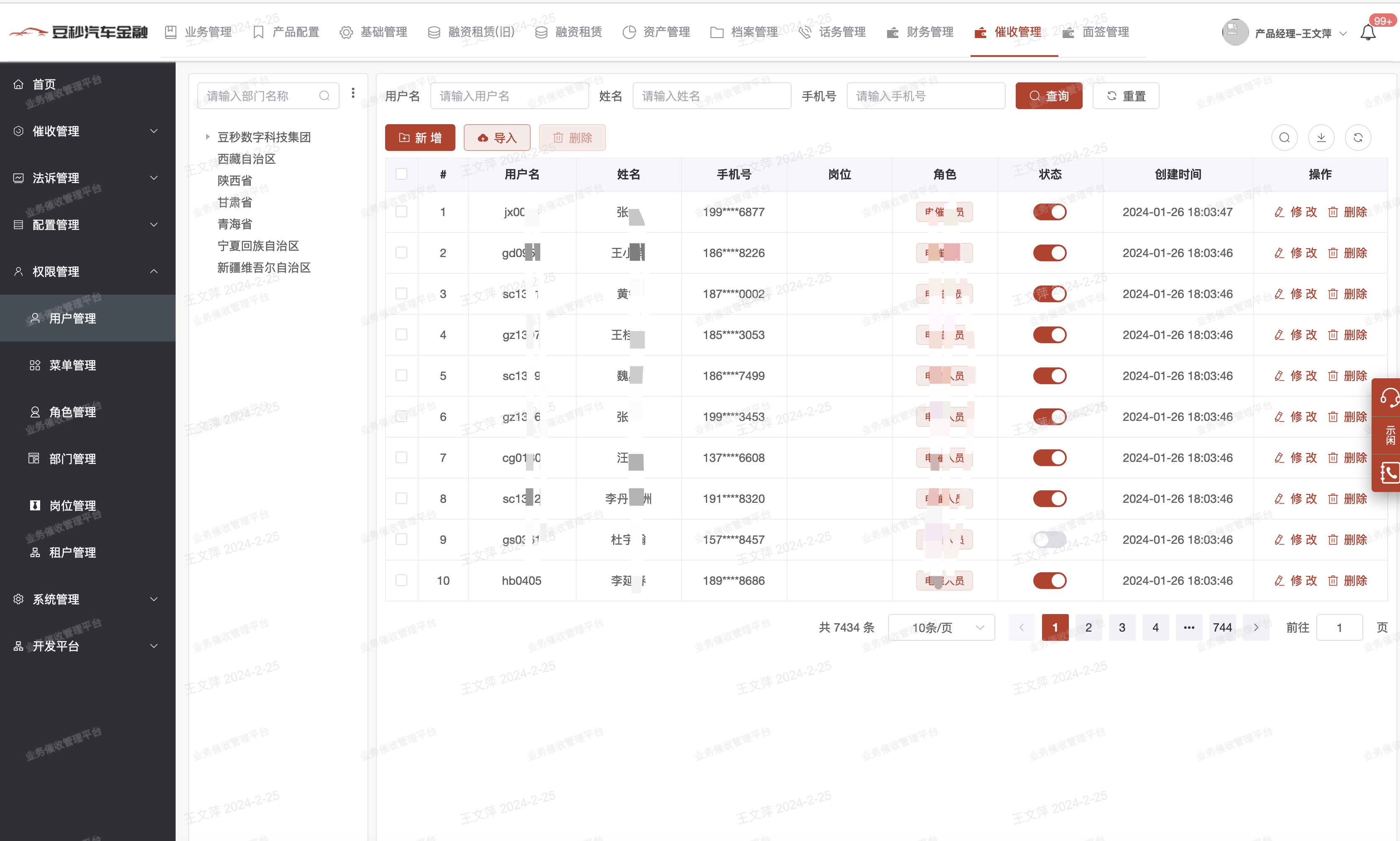 a)模块说明:要展开催收业务前提是为业催、电催、内勤、法务赋予角色和岗位。赋予后才能正常使用催收系统;