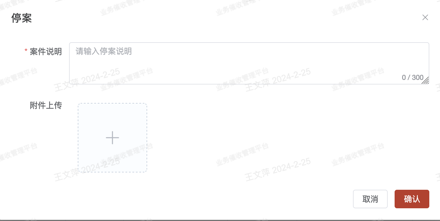 d)停案:点击可暂停案件,填写停案说明和附件,暂停催收任务;