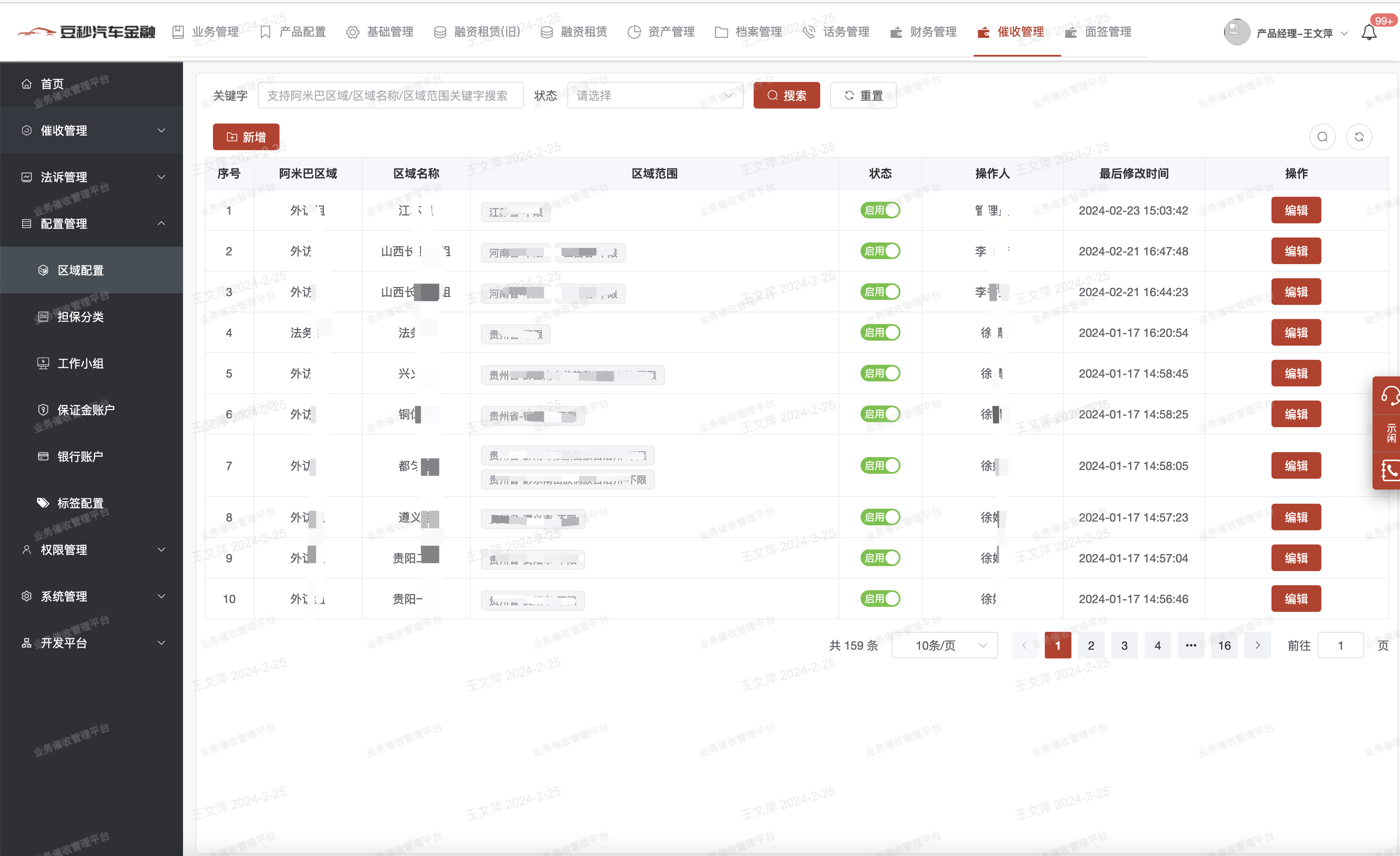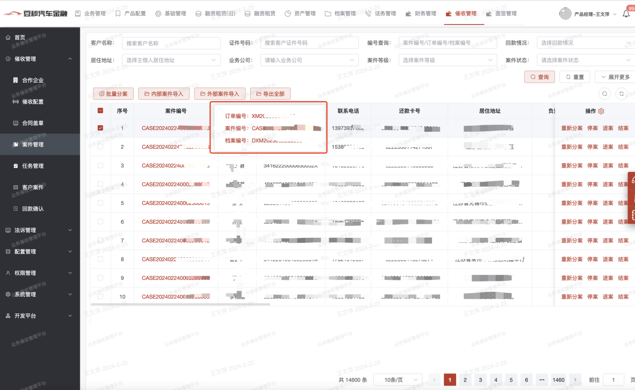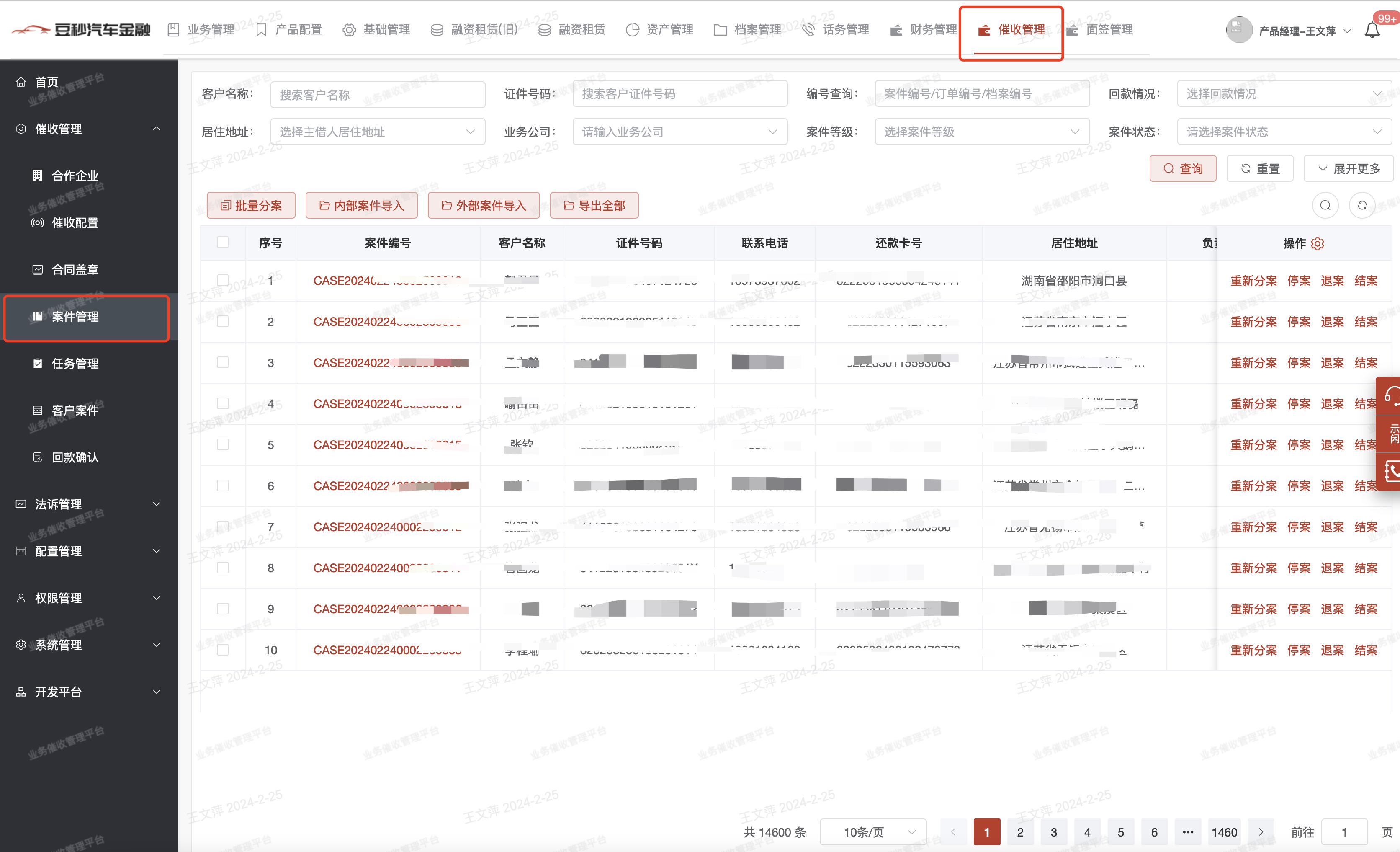 3、搜索区域:支持客户姓名、证件号码、编号、回款情况、居住地址、业务公司、案件等级、案件状态、负责催收、放款时间范围、创建时间范围进行搜索;